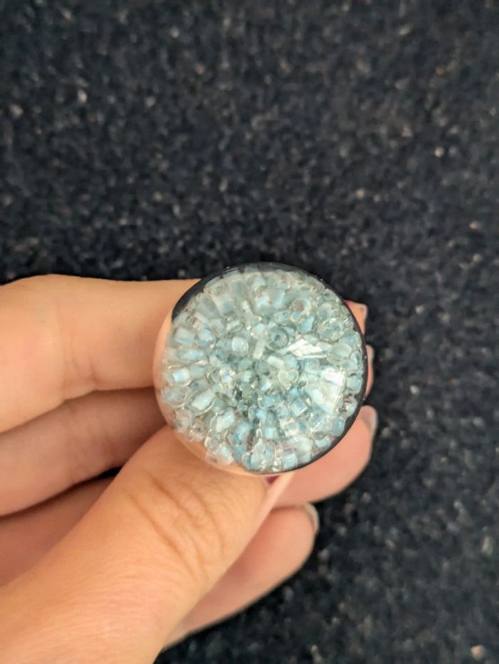 Bague fantaisie en verre transparente remplie de perles bleues clair. Taille ajustable. N'hésitez pas a checker mon dressing j'ai beaucoup de paires dans ce style. Et il y a une remise sur les lots. Pour 1€ de plus je peux rajouter une pochette pochette à maquillage rouge avec un petit miroir, si cela vous intéresse envoyez moi un message. #morganelcfbijoux