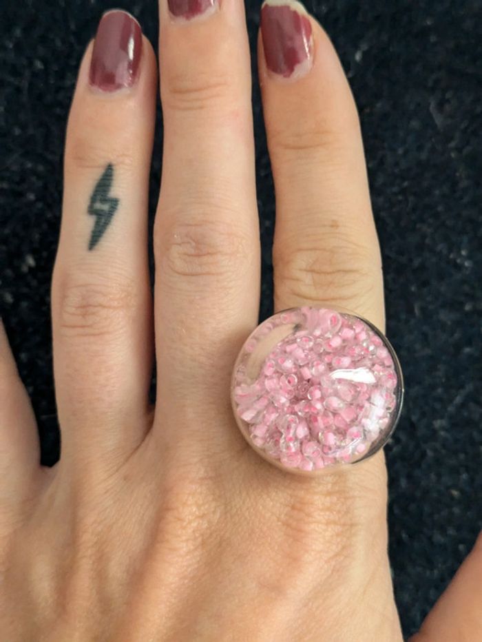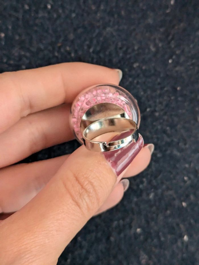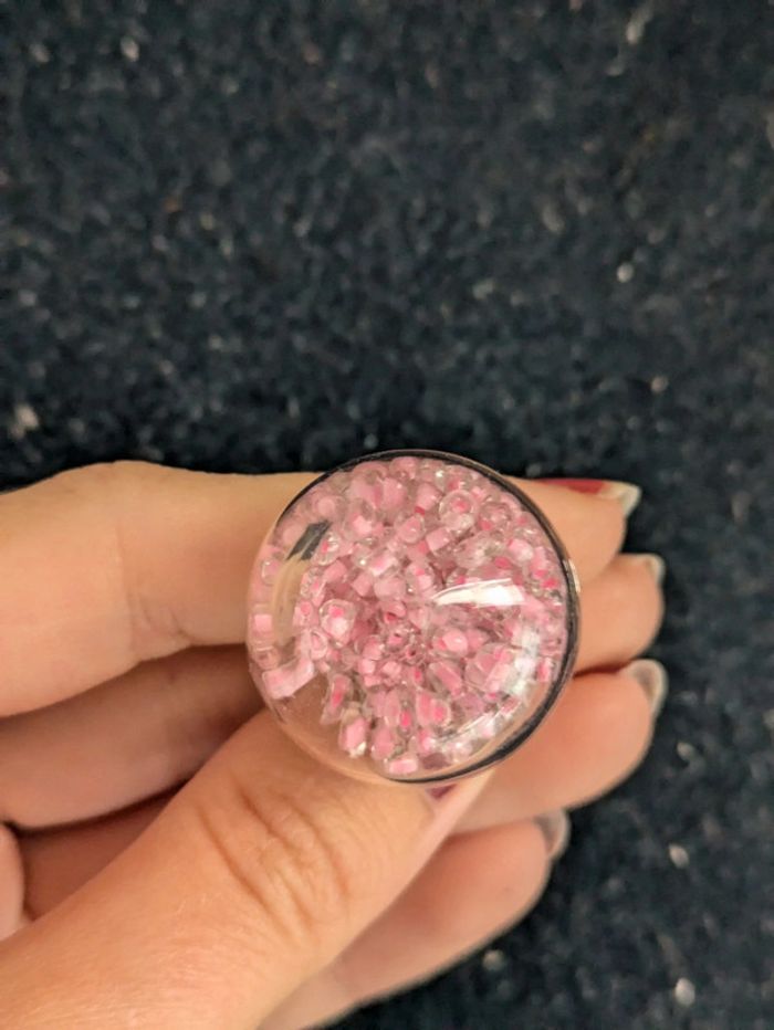 Bague fantaisie en verre transparente remplie de perles roses. Taille ajustable. N'hésitez pas a checker mon dressing j'ai beaucoup de paires dans ce style. Et il y a une remise sur les lots. Pour 1€ de plus je peux rajouter une pochette pochette à maquillage rouge avec un petit miroir, si cela vous intéresse envoyez moi un message. #morganelcfbijoux