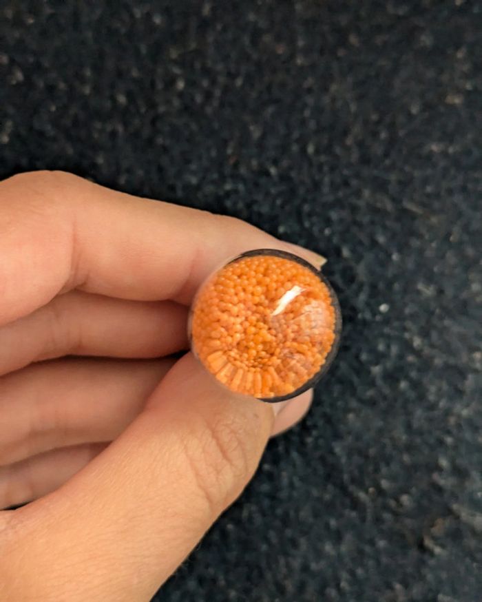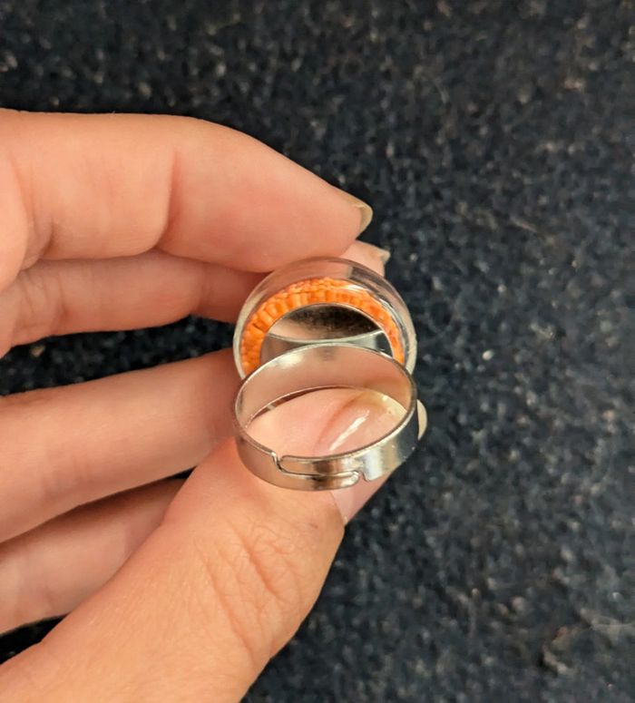 Bague fantaisie en verre transparente remplie de perles oranges. Taille ajustable. N'hésitez pas a checker mon dressing j'ai beaucoup de paires dans ce style. Et il y a une remise sur les lots. Pour 1€ de plus je peux rajouter une pochette pochette à maquillage rouge avec un petit miroir, si cela vous intéresse envoyez moi un message. #morganelcfbijoux