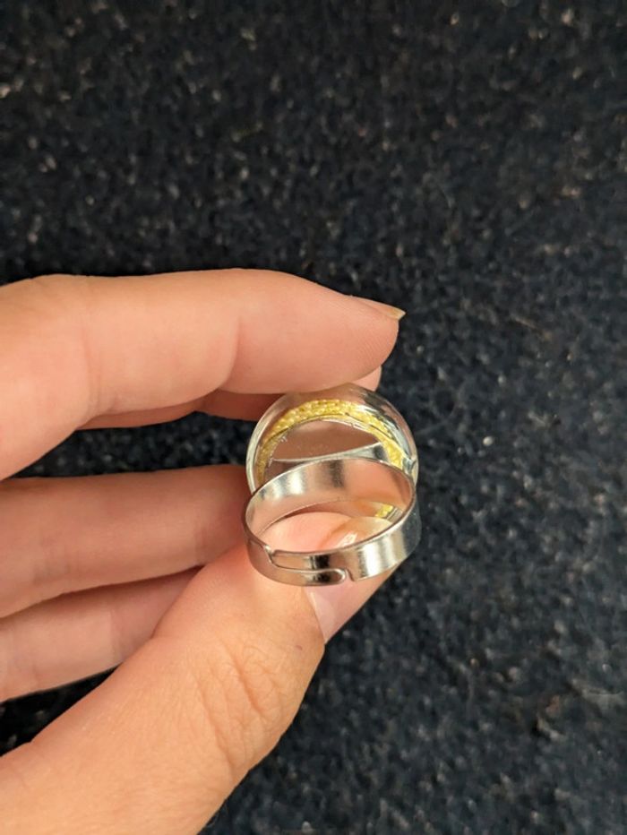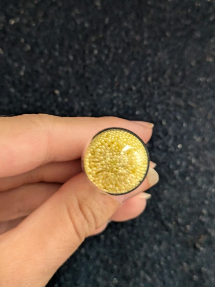 Bague fantaisie en verre transparente remplie de perles jaunes. Taille ajustable. N'hésitez pas a checker mon dressing j'ai beaucoup de paires dans ce style. Et il y a une remise sur les lots. Pour 1€ de plus je peux rajouter une pochette pochette à maquillage rouge avec un petit miroir, si cela vous intéresse envoyez moi un message. #morganelcfbijoux