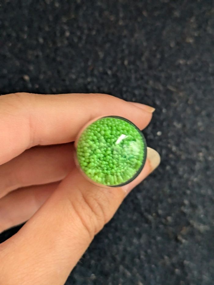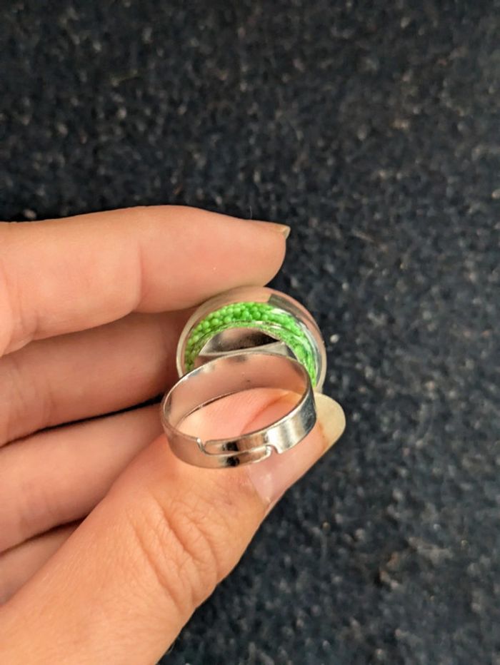 Bague fantaisie en verre transparente remplie de perles vertes pomme. Taille ajustable. N'hésitez pas a checker mon dressing j'ai beaucoup de paires dans ce style. Et il y a une remise sur les lots. Pour 1€ de plus je peux rajouter une pochette pochette à maquillage rouge avec un petit miroir, si cela vous intéresse envoyez moi un message. #morganelcfbijoux