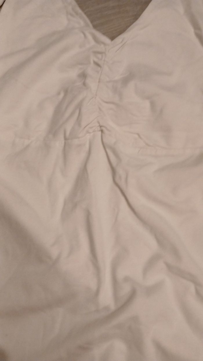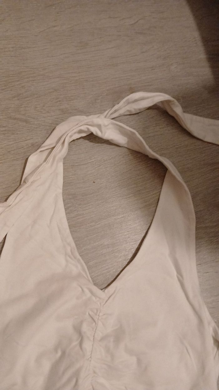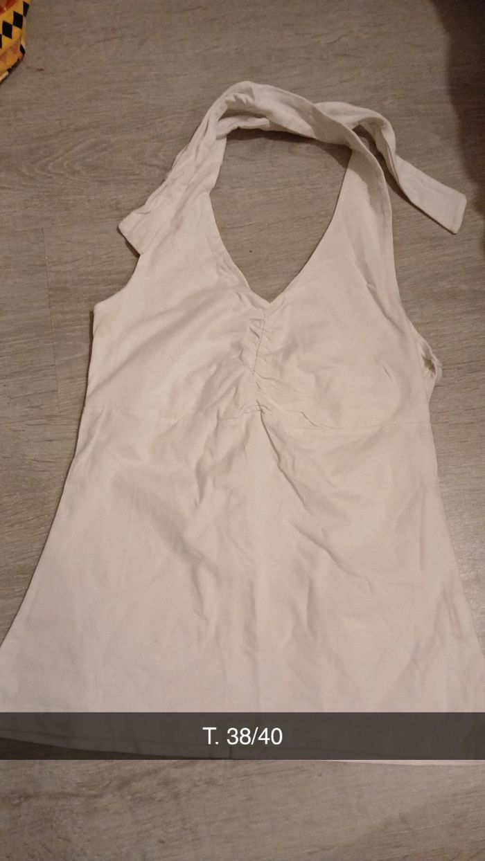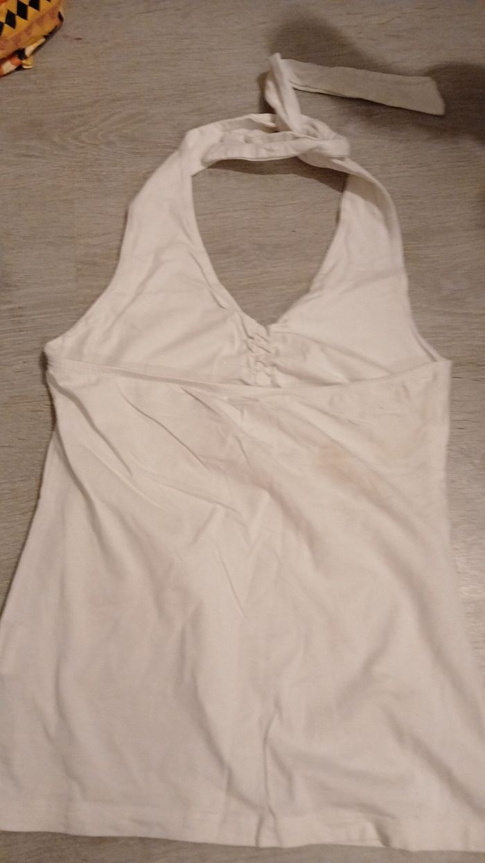 Débardeur blanc, dos nu à nœud autour du cou. De couleur blanc, taille 38/40. Très bon état. 95% coton 5% elastanne.