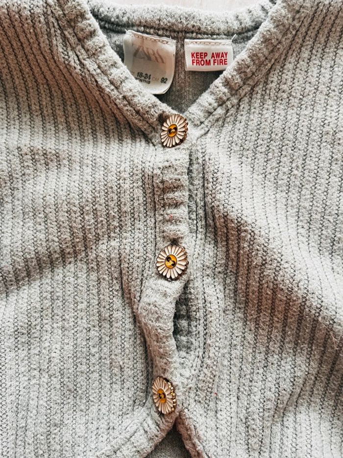 Gilet en laine pour petite fille Marque Zara Taille 18-24 mois Coloris gris avec boutons fleurs En très bon état