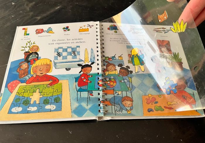 Livre interactif sur l’école maternelle avec des belles images précises et réalistes + des pages transparentes pour faire des découvertes En très bon état Prix: 4€