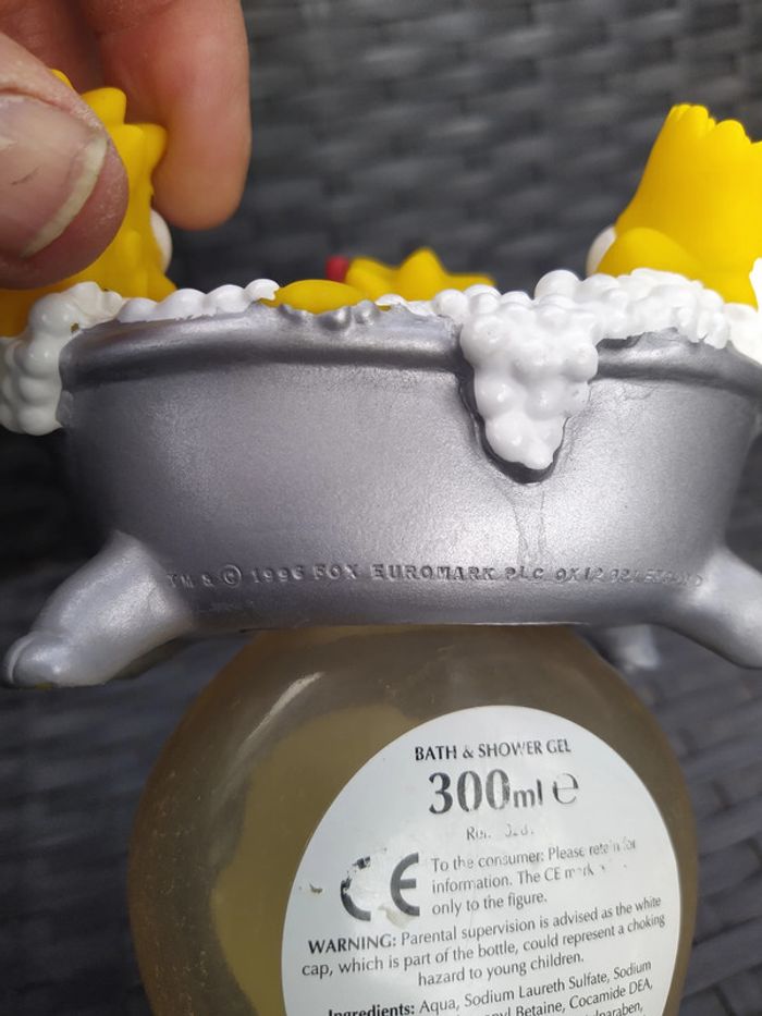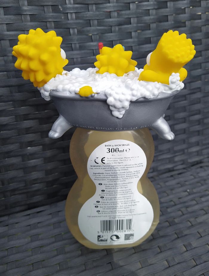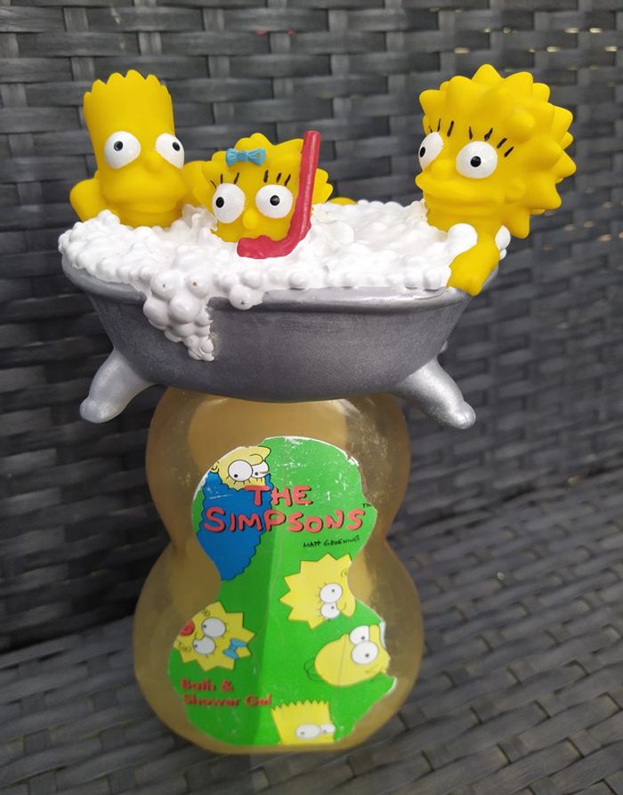 Figurine enfants simpsons. La baignoire se dévisse pour accéder au gel bain et douche du flacon. Editée par euromark en 1997. En bon état mis à part un manque d'étiquette. Hauteur 19 cms.