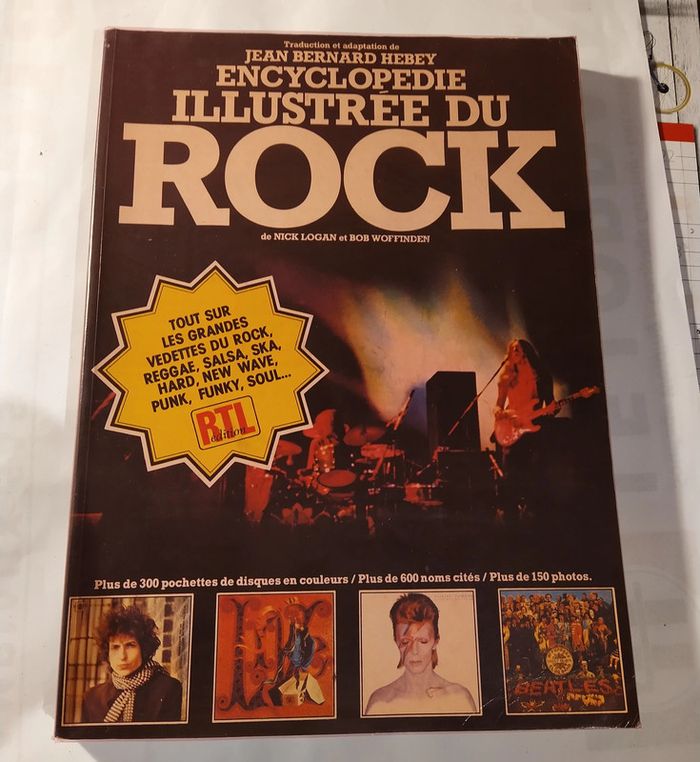 Encyclopédie illustrée du rock, très rare. Auteurs D Logan et B Woffinden. Edité par RTL en 1980. 256 pages. Plus de 300 pochettes de disques en couleur. En parfait état pour son âge. Protégé par film protecteur (non autocollant) qui explique son état irréprochable.