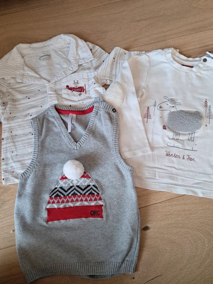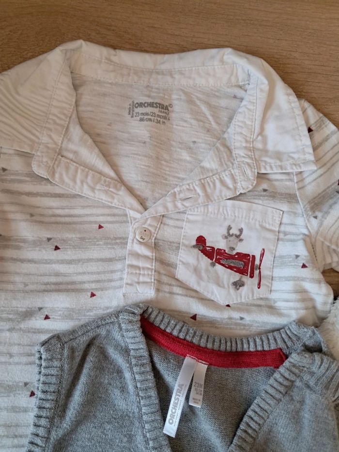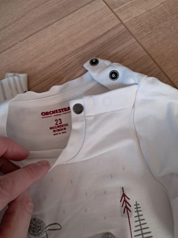 Tee shirt, très jolie pour les fêtes. É très bon état. Juste micro tâche sur une manche. Très peu visible. Taille 24 mois, orchestra