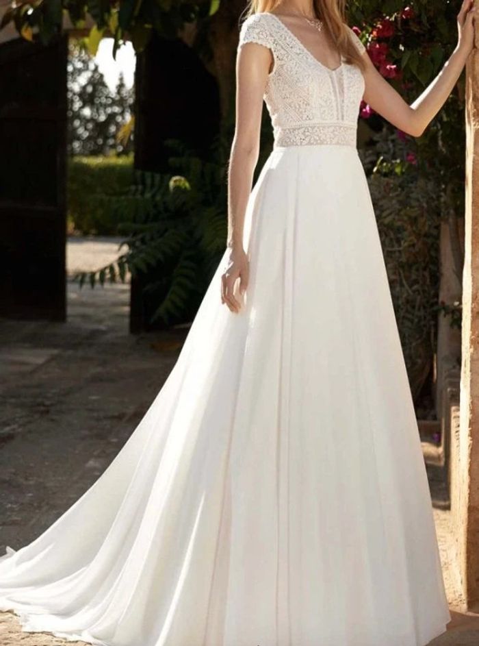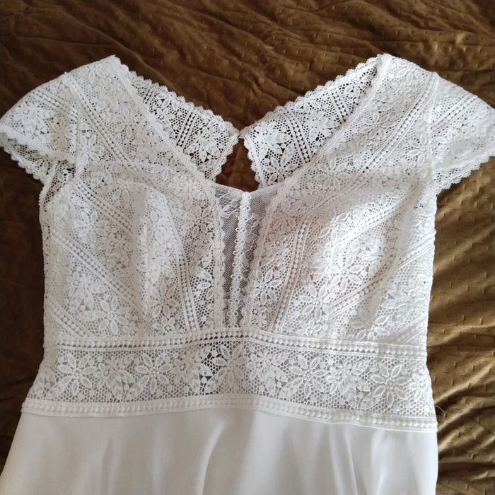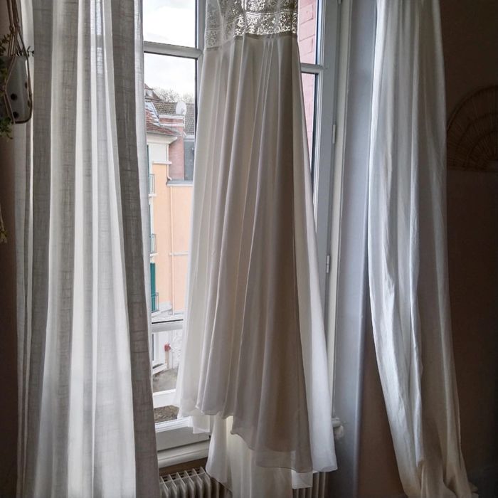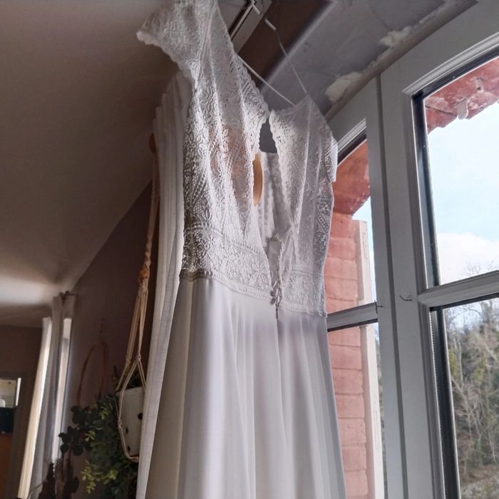 De. Robe longue si elle doit être recoupée cela ne se verra pas. Je fais un 40/42 . Je mesure 1m73. Robe de couleur blanche en mousseline très jolie. Manches courtes et une partie du dos est ajourée. Elle a été apportée au pressing. Robe en très bon état acheter en 2023. J'ai également le jupon qui va avec pour mettre en dessous de la robe. Paire de chaussures blanche disponible également dans ma vitrine ainsi q'un magnifique boléro. N'hésitez pas à faire un lot