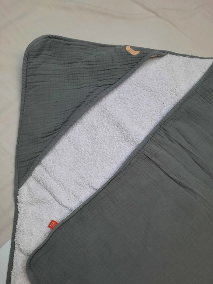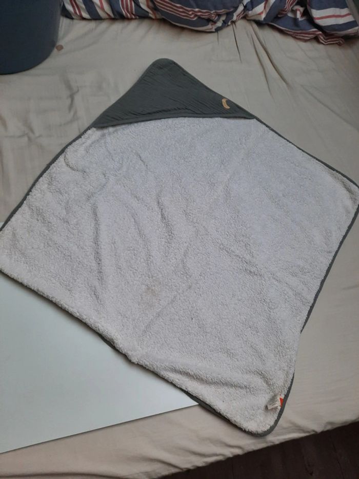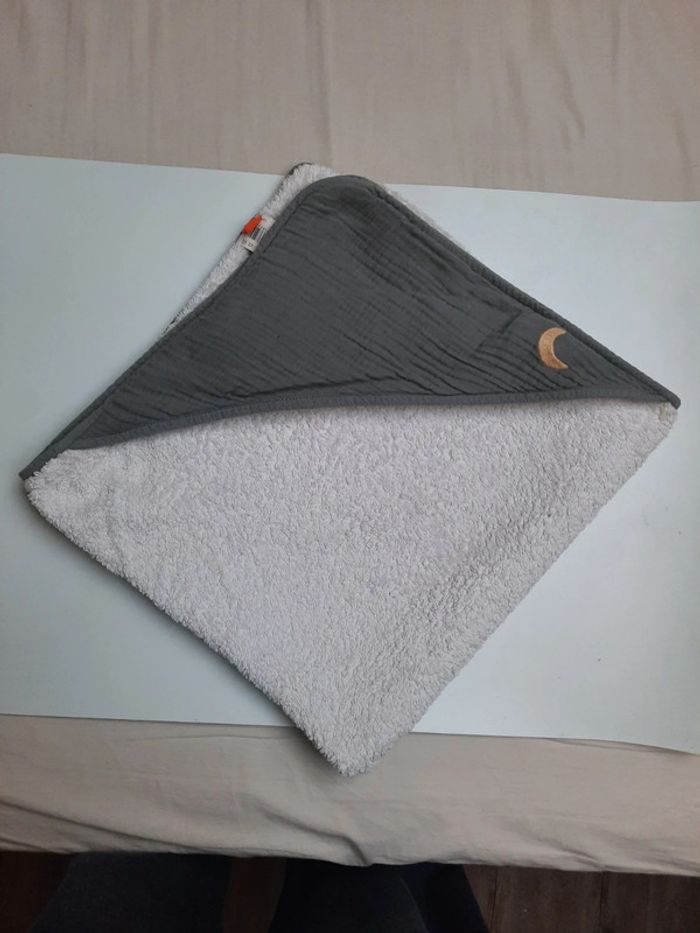 Grande cape de bain la redoute en coton biologique. 1 face coton bio 1 face gaze de coton gris chiné. Motif lune brodé Serviette de bain pour bébé avec capuche. Il y a une légère décoloration de petite taille sur la face éponge. Mais vraiment rien de grave. Le tissus est encore tout doux Lot possible dans mon dressing avec réduction