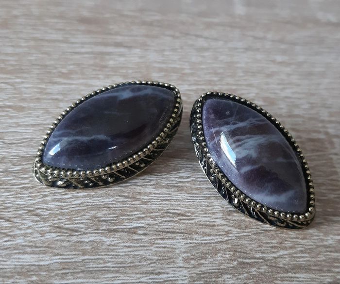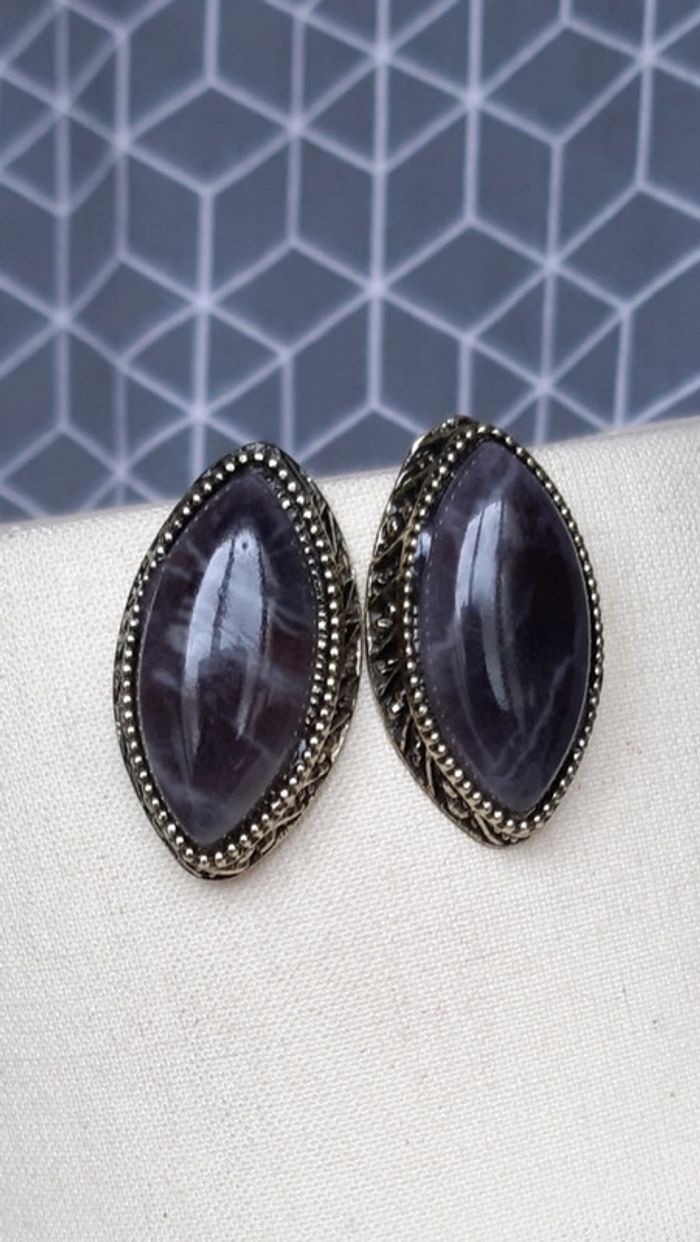 Boucles d'oreilles en losange, rendu pierre noir, sur support en acier vieillie. Super rendu. Très bonne qualité.