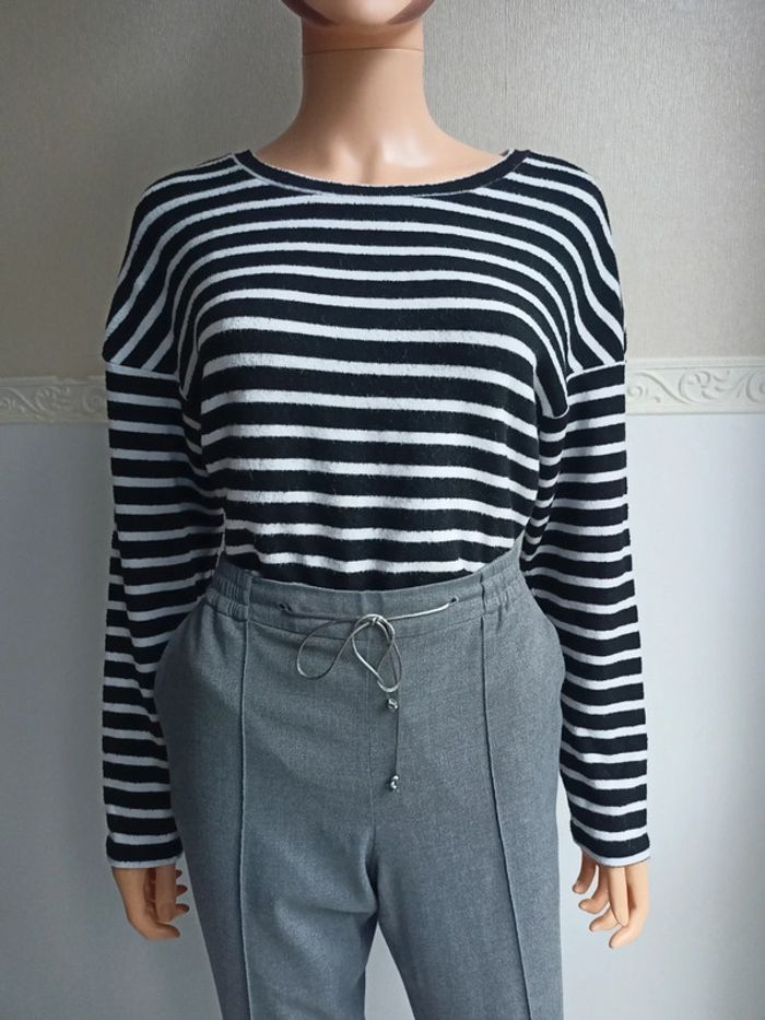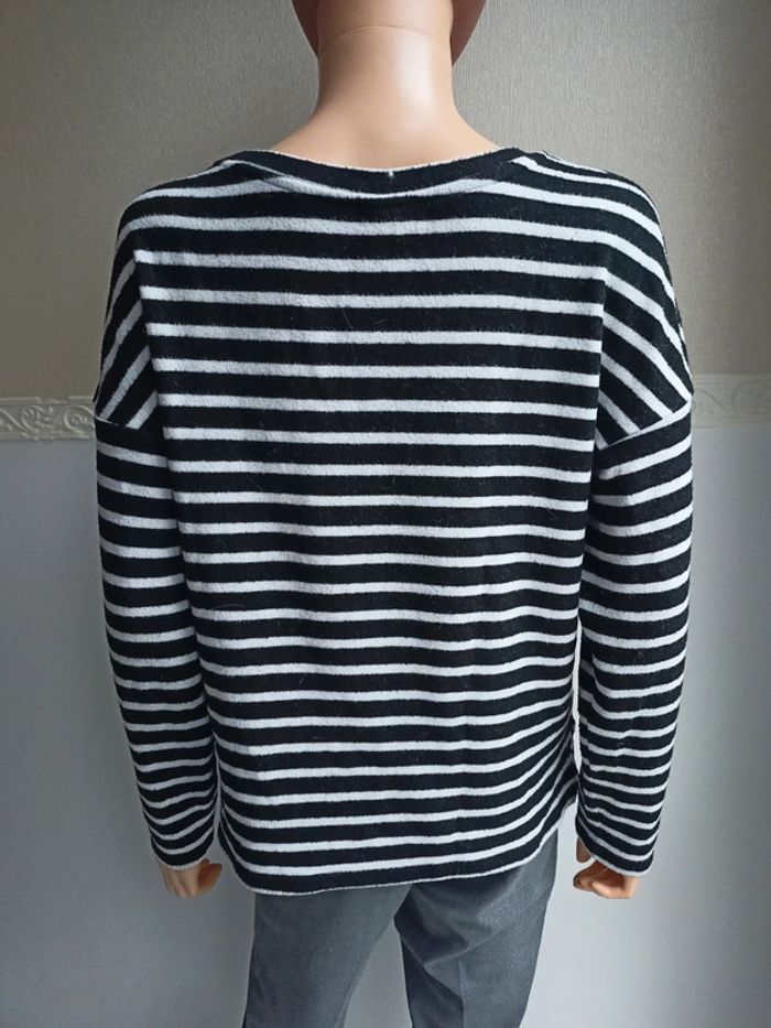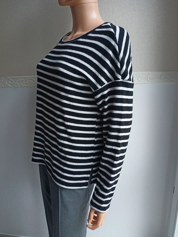Pull rayé noir et blanc, marque H&M. En bon état car comporte quelques petites bouloches. Tout doux, fin mais tient quand même chaud. Indiquée Taille S mais correspond également à un M car taille large. En 54% viscose , 42% polyester et 4% élasthanne. Épaules basses