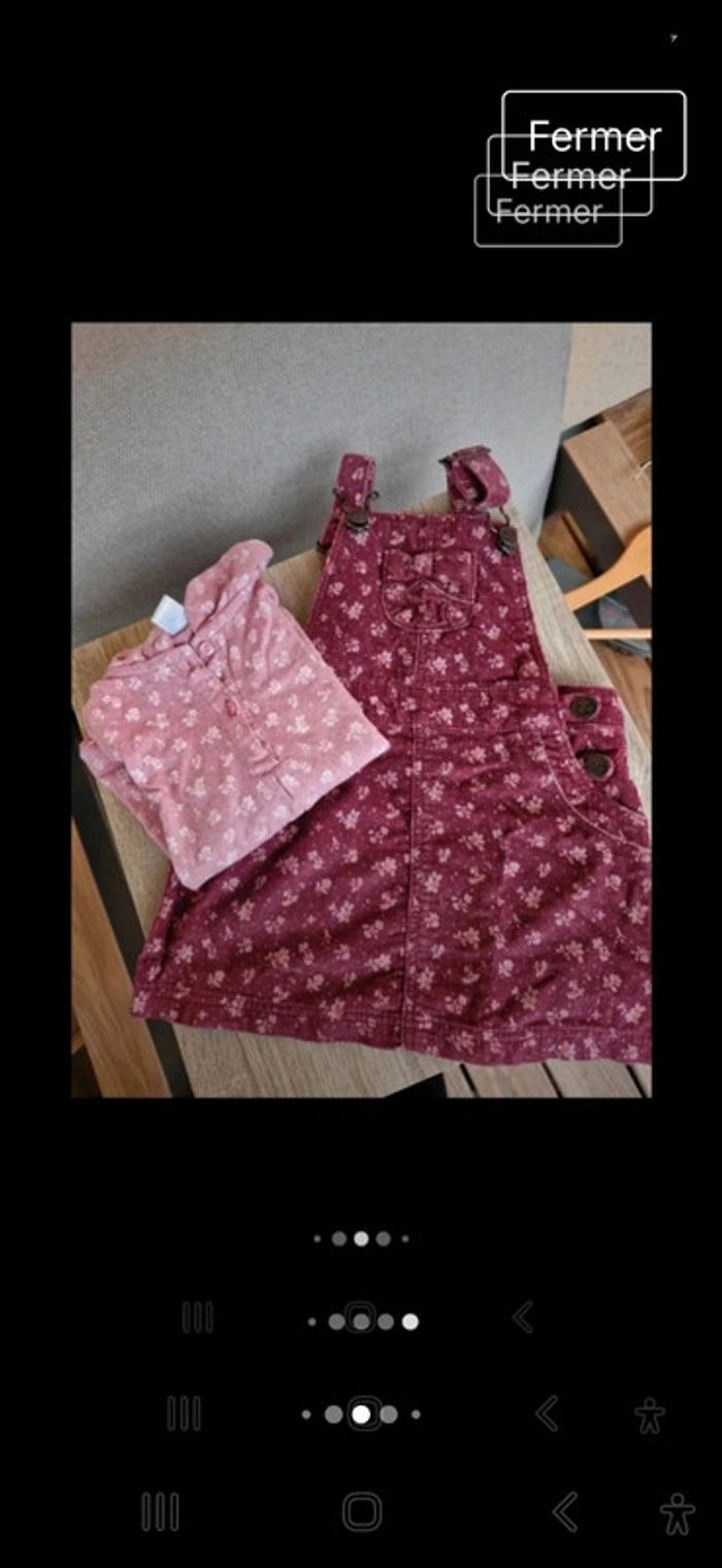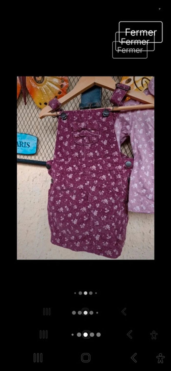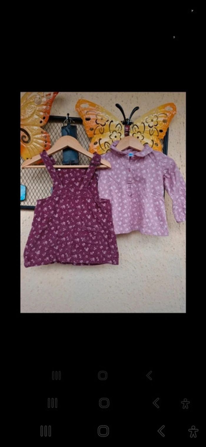 #manouwfille18mois Ensemble fille, Robe salopette, velours ras, couleur bordeaux avec des fleurs. 100% coton Tee shirt fille, couleur pourpre avec des fleurs. 100% coton. Taille 18 mois. Marque TeX baby Très bon état