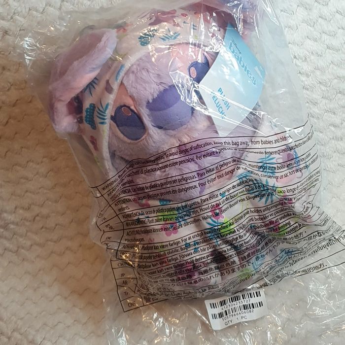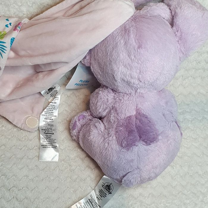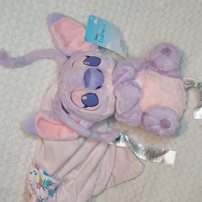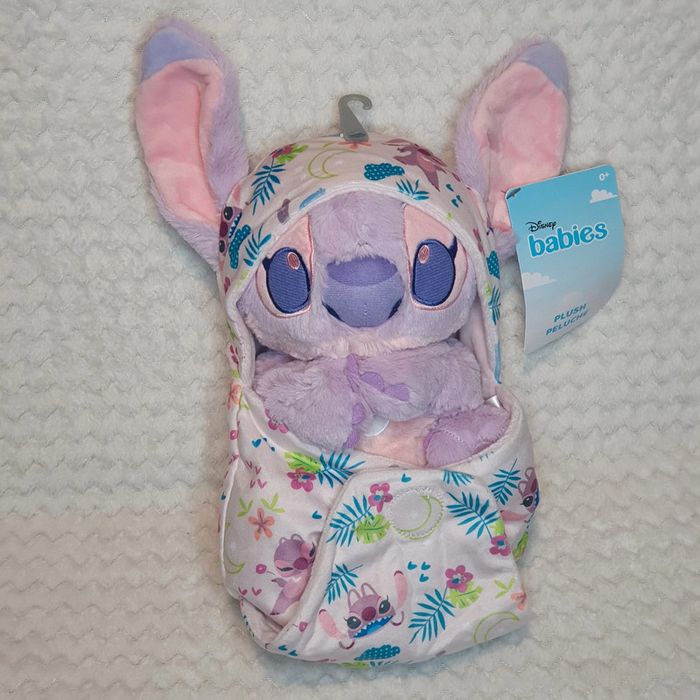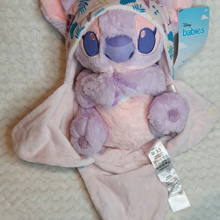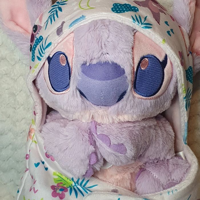 Peluche Angel violette pastel lila kawaii baby Lilo & Stitch (2002) visage brodé, tissu duveteux, touffe de cheveux, oreilles tombantes, lange amovible et réversible en velours avec motif tropical imprimé, fermeture à scratch 🌸✨️ neuf avec étiquette dans son emballage jamais servi