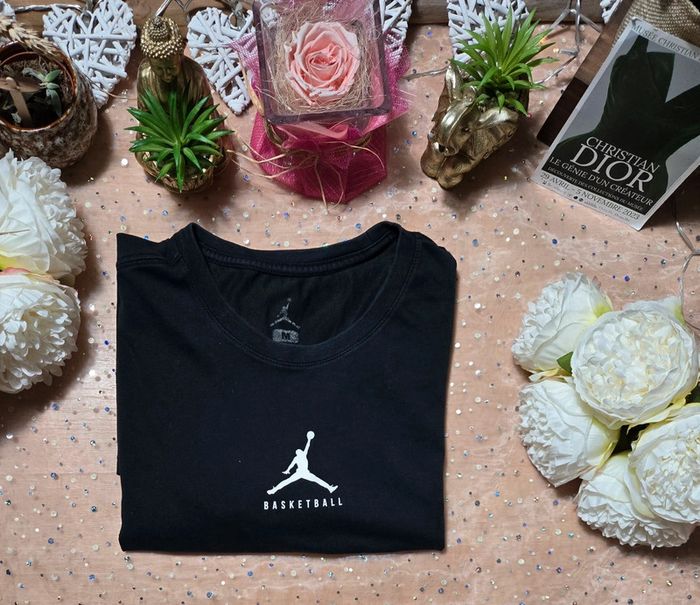 ☆t-shirt Jordan♡ ☆taille M ☆noir ☆à recolorer il existe en grande surface des colorants pour vêtements ☆58%coton 32%polyester ☆imperfections trace blanche sous les aisselles visible sur les 2 dernières photos #letty282M #maillotjordan #tshirtnoirjordan