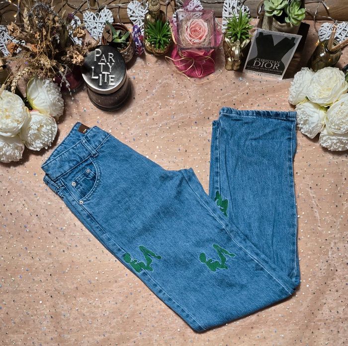 ☆Jeans Jennyfer♡ ☆taille 34 ☆bleu ☆jambes larges ☆taille haute ☆2 poches avant ☆2 poches arrière ☆mesure de la taille 34cm ☆longueur jambe 108cm ☆longueur entrejambe 87cm ☆belle qualité extensible ☆100%coton ☆parfait état #letty282tailleXS #jeanstaillehaute #jeansjambes