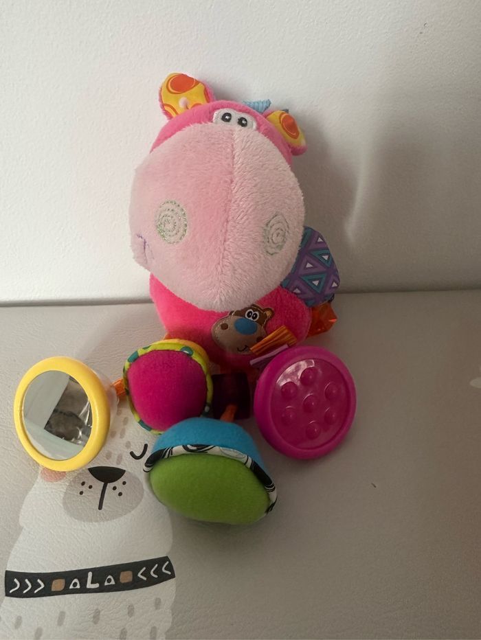 Un cheval rigolo avec plusieurs activités. Des petits anneaux et les différents matériaux encouragent les capacités motrices, les couleurs vives éveillent l’attention visuelle Quelques traces usures sur le miroir de l'objet jaune
