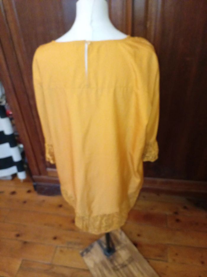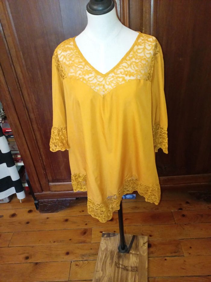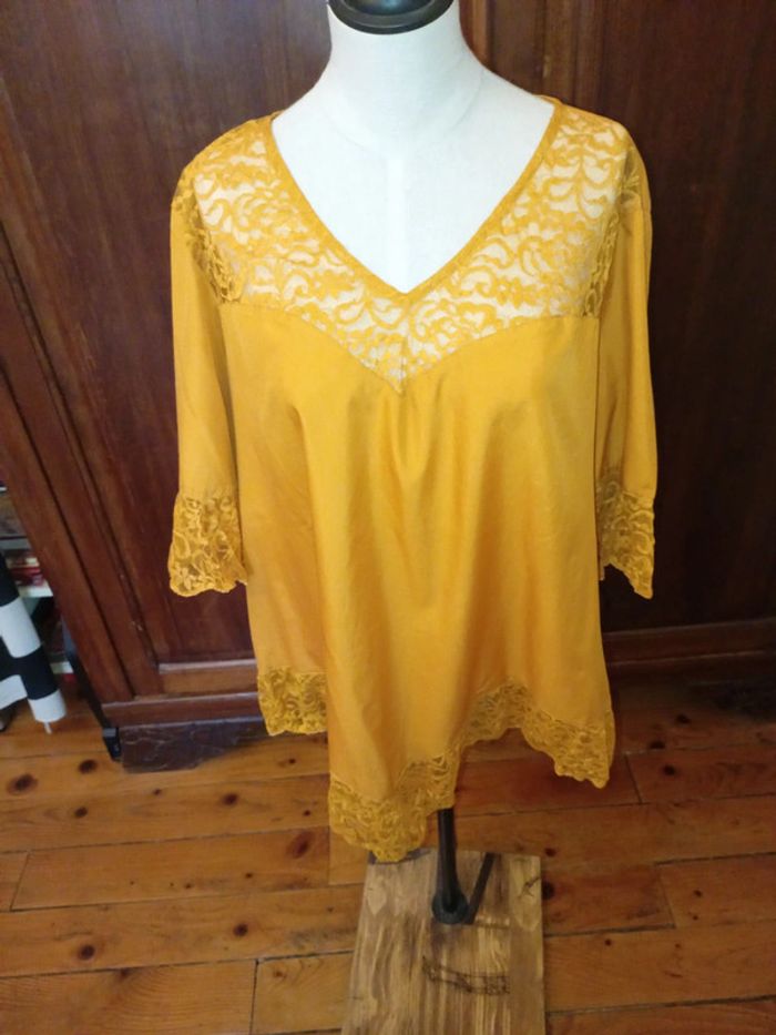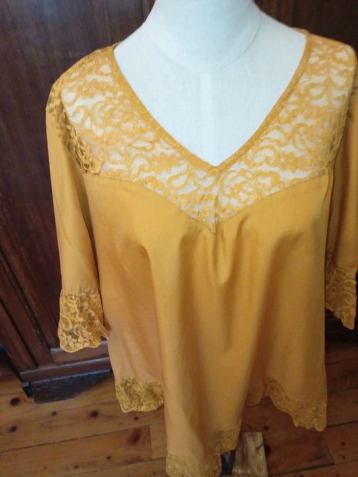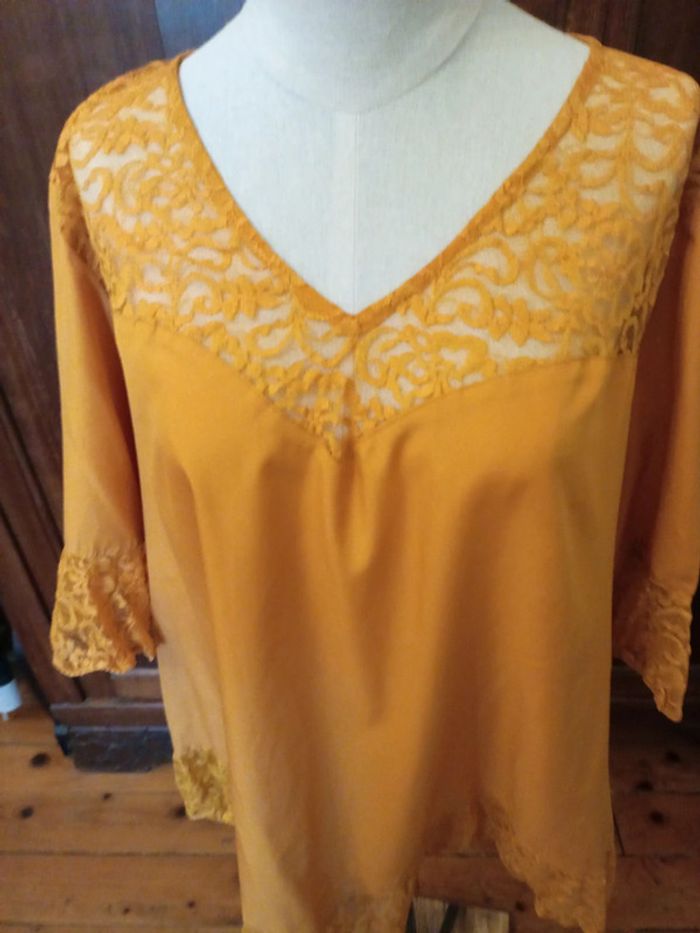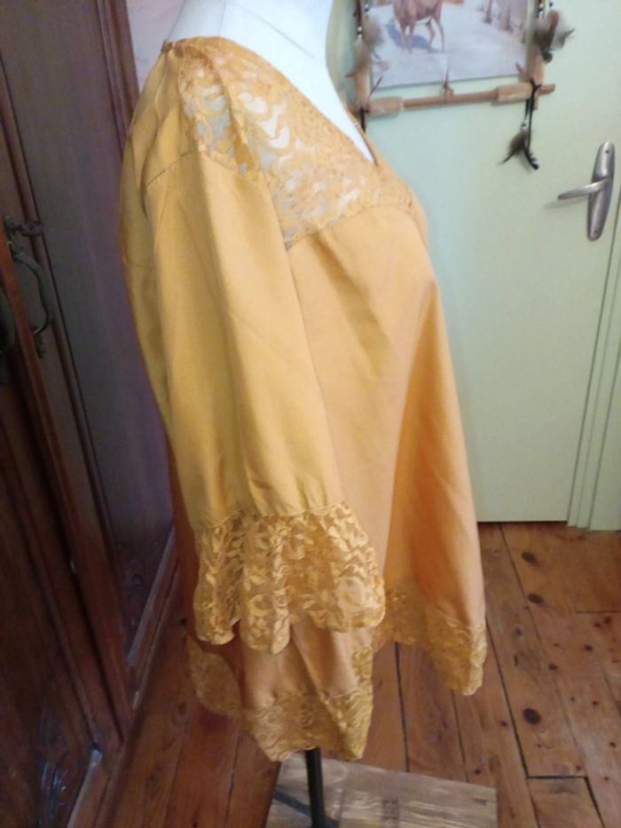 Tunique à manches courtes neuve, jamais portée. Col V agrémenté de dentelle Rappel de dentelle aux manches ainsi qu'à la base de la tunique. Coupe en V à l'avant et à l'arrière de la tunique. Se ferme par un petit bouton dans le dos 100 % polyester Taille 52 #hautfemmeT52eilsel0 #articlesneufseilsel0