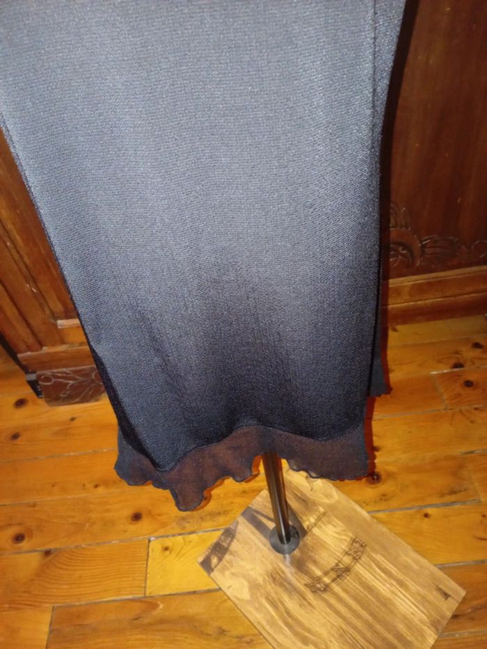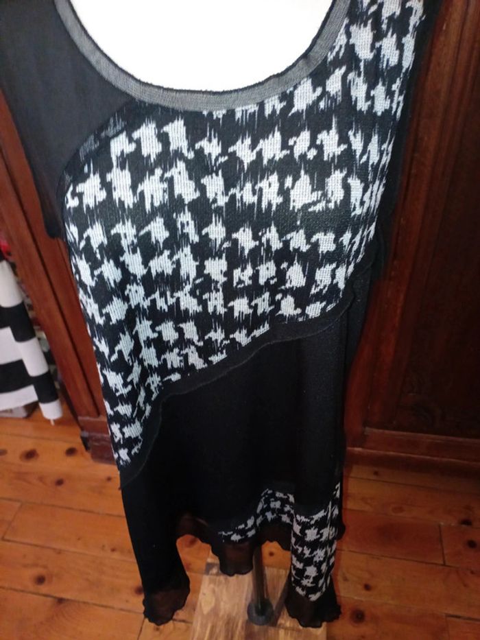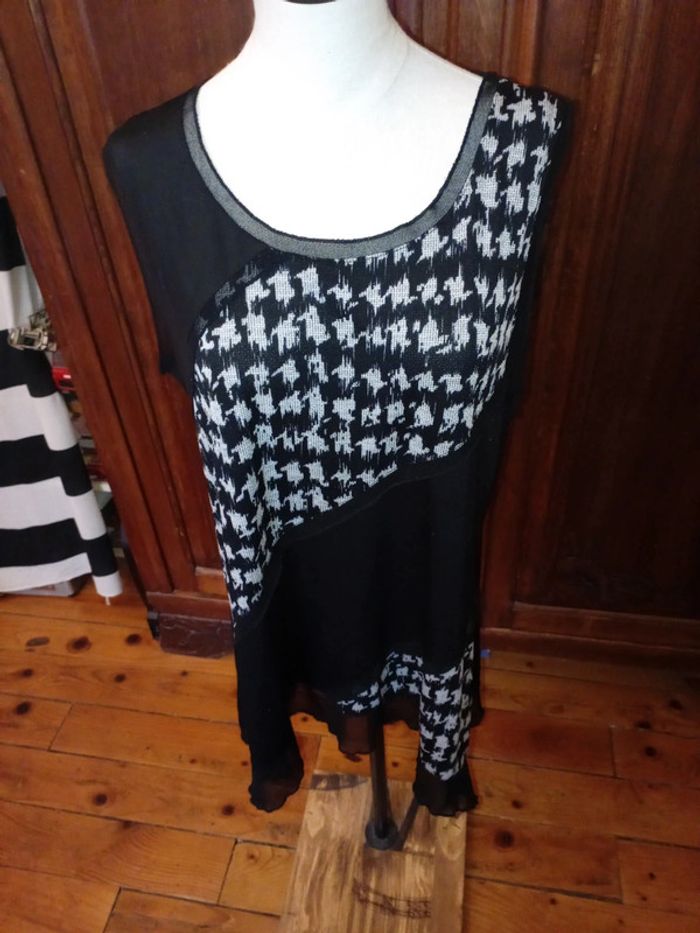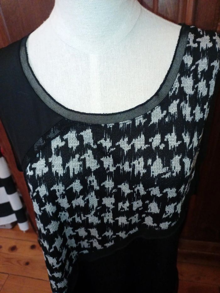 Tunique sans manche en très bon état car peu portée. Col rond Motifs gris devant, dos noir uni Façon dentelle au col avec rappel aux bords des épaules et en bas de la tunique. 95 % polyester et 5 % élasthanne Taille 5 correspond à une taille 48 #hautfemmeT48eilsel0