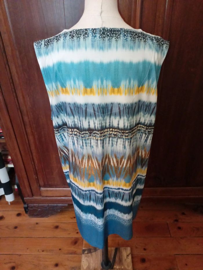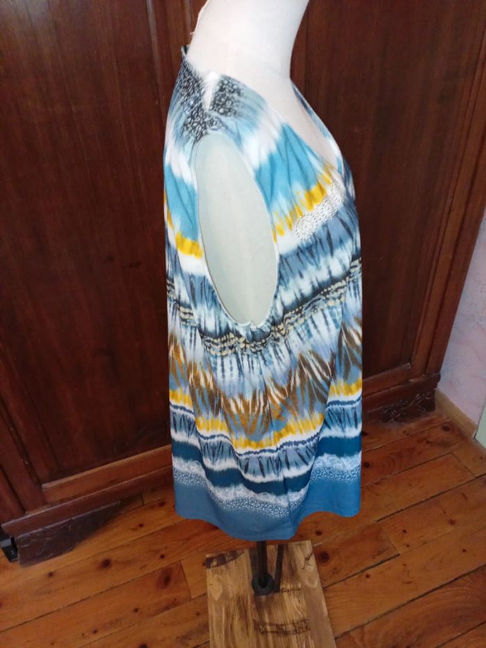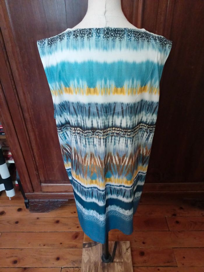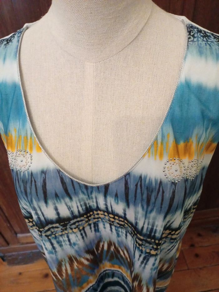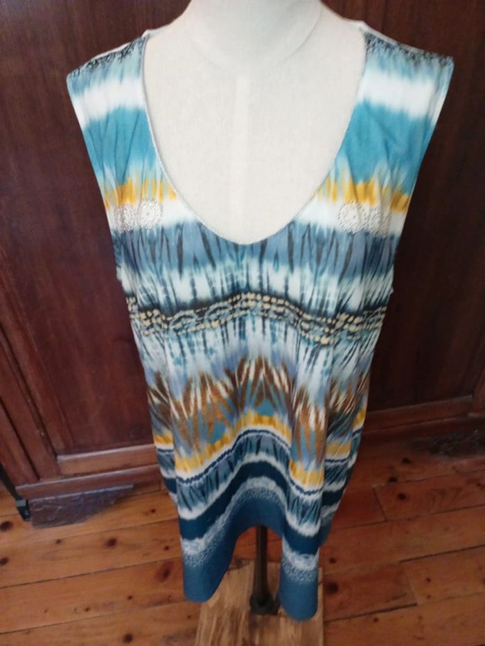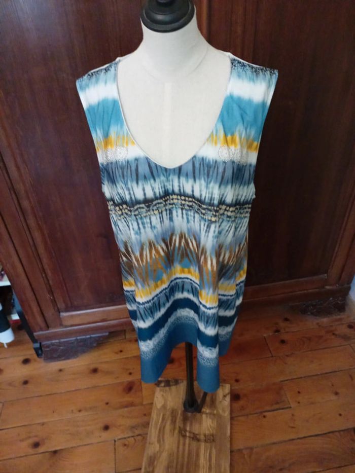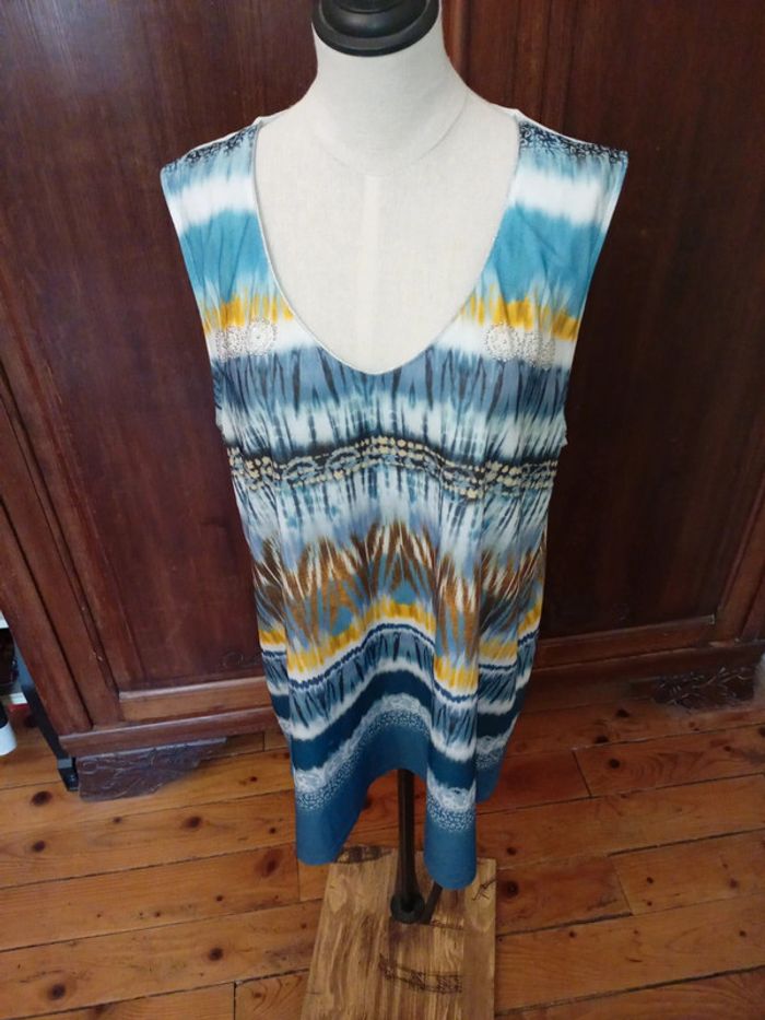 Tunique sans manche en parfait état car très peu portée. Col légèrement en V agrémenté d'un fin liseré argenté. Un motif argenté de chaque côté de la tunique Plusieurs coloris avec une dominante de bleu 93 % polyester et 7 % élasthanne Taille 5 correspond à une taille 48 #hautfemmeT48eilsel0