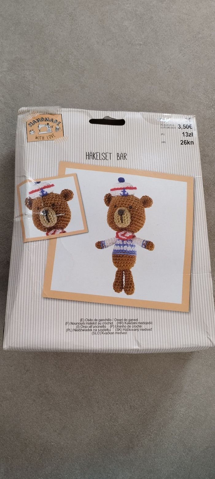 Bonjour, Je vends ce kit pour créer un ours en crochet neuf jamais servi mais emballage abîmé