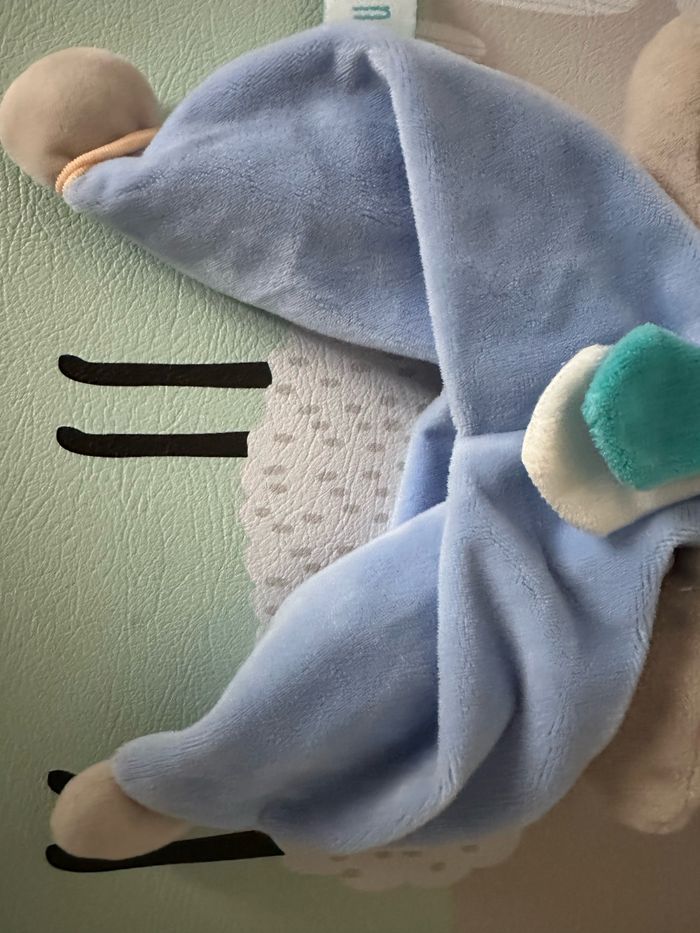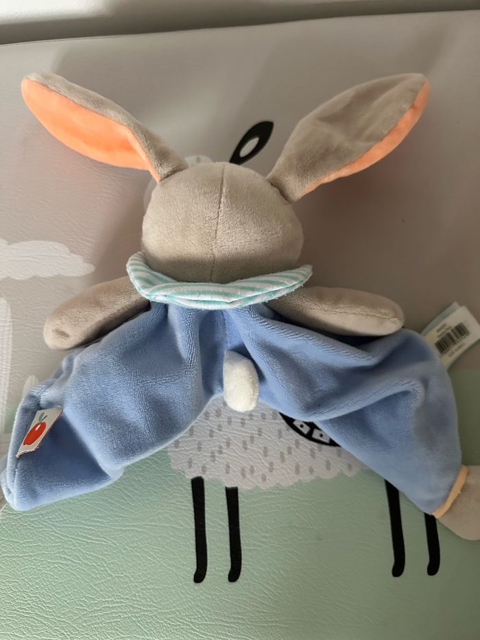 Doudou pom en forme de lapin Le doudou est très bonne état et il n'a jamais été utilisé. Quelques peluches au niveau du col. Il y a l'étiquette de composition