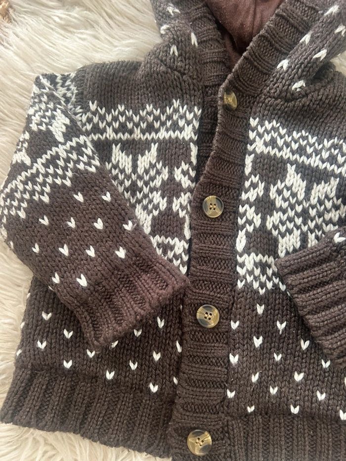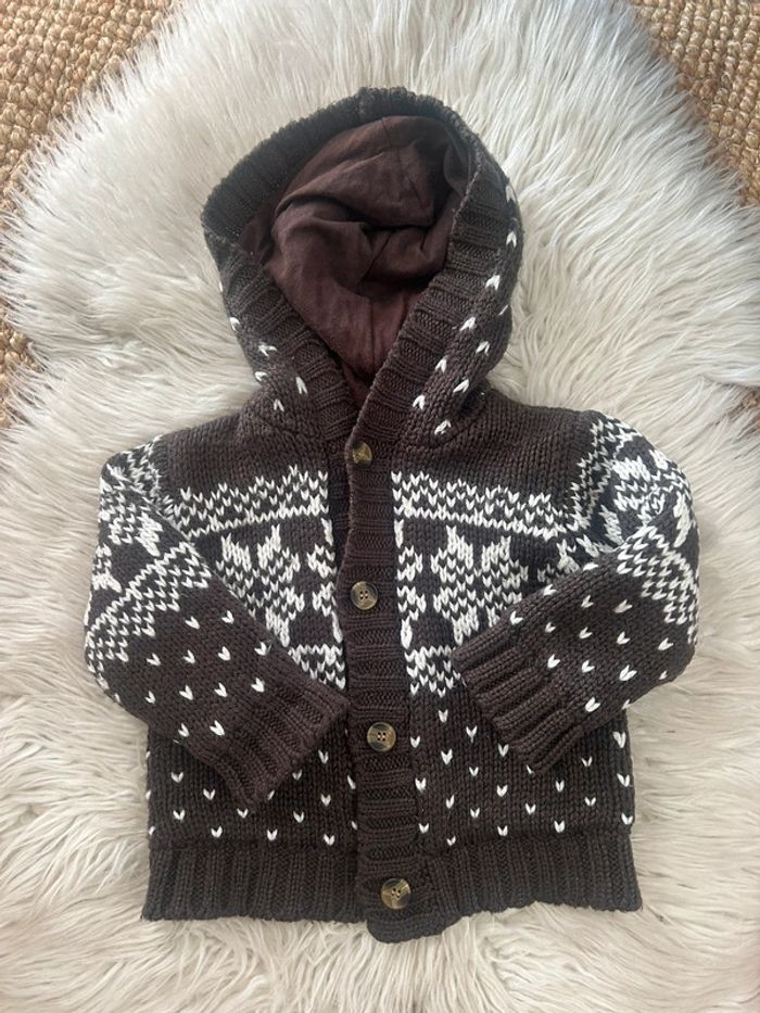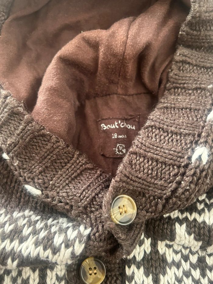 Veste mi saison a capuche Bout’chou taille 18 mois Grosse maille Marron/blanc #dressvetbbgarcon 🎀 Merci de lire la description de mon profil avant tout contact ou achat 🎀