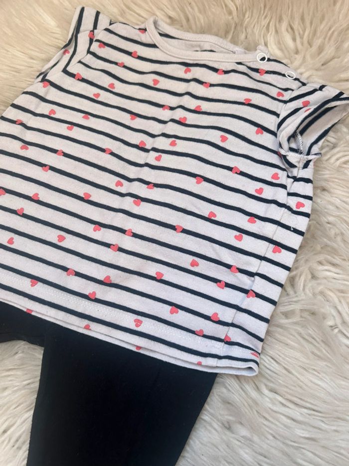 Ensemble mi saison/été Taille 6 mois Tshirt manches courtes marinière noir/blanc avec coeurs rose + legging noir En tbe #dressvetfille06mois 🎀 Merci de lire la description de mon profil avant tout contact ou achat 🎀