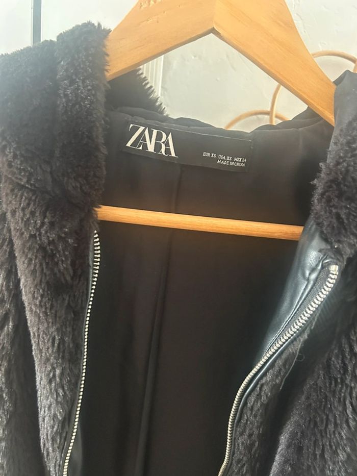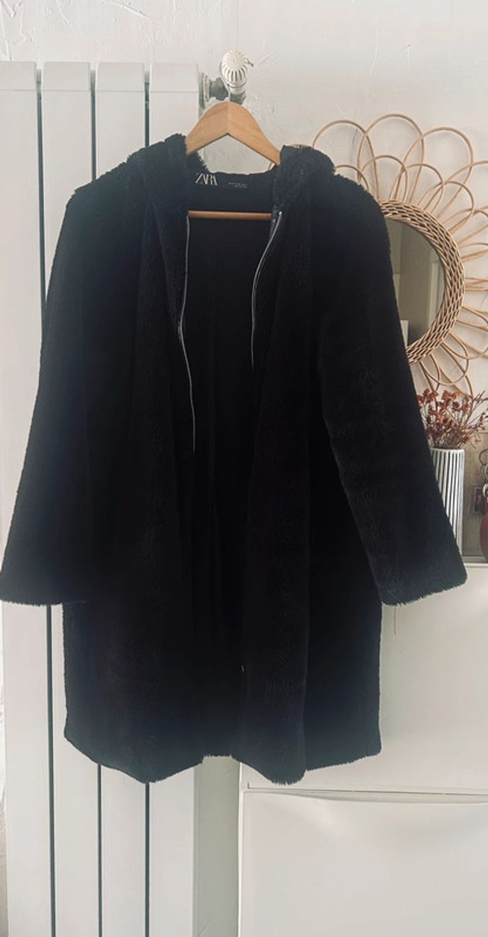 Femme 👩🏻 Manteau/veste longue a capuche noir en fausse fourure. Zara taille XS 34/36 - photo numéro 2
