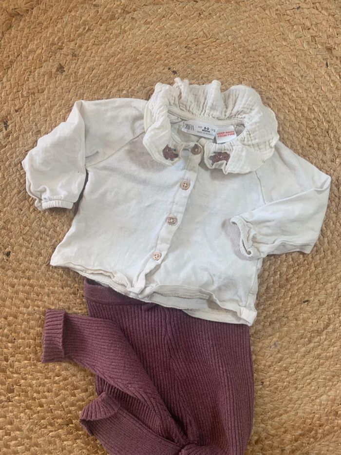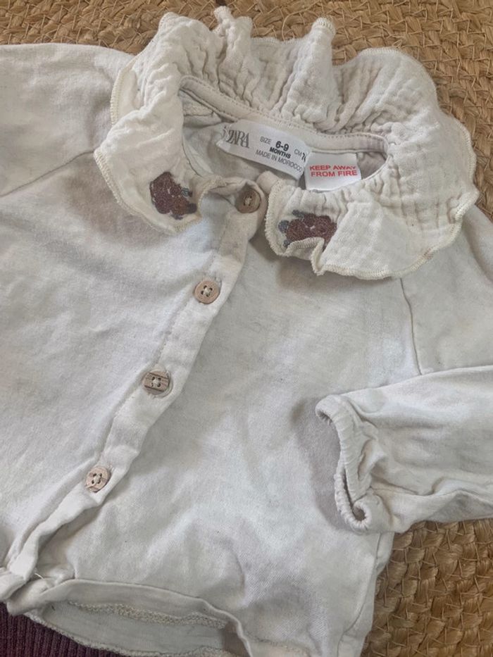 Chemise manches longues beige/crème avec col a fleurs en gaze de coton zara ❌ etiquette 6/9 mais taille comme un 3/6 mois !! ma fille l’a portée lorsqu’elle mettait du 3/6 en tbe ❌ legging deja vendu non dispo #dressvetfille06mois 🎀 Merci de lire la description de mon profil avant tout contact ou achat 🎀