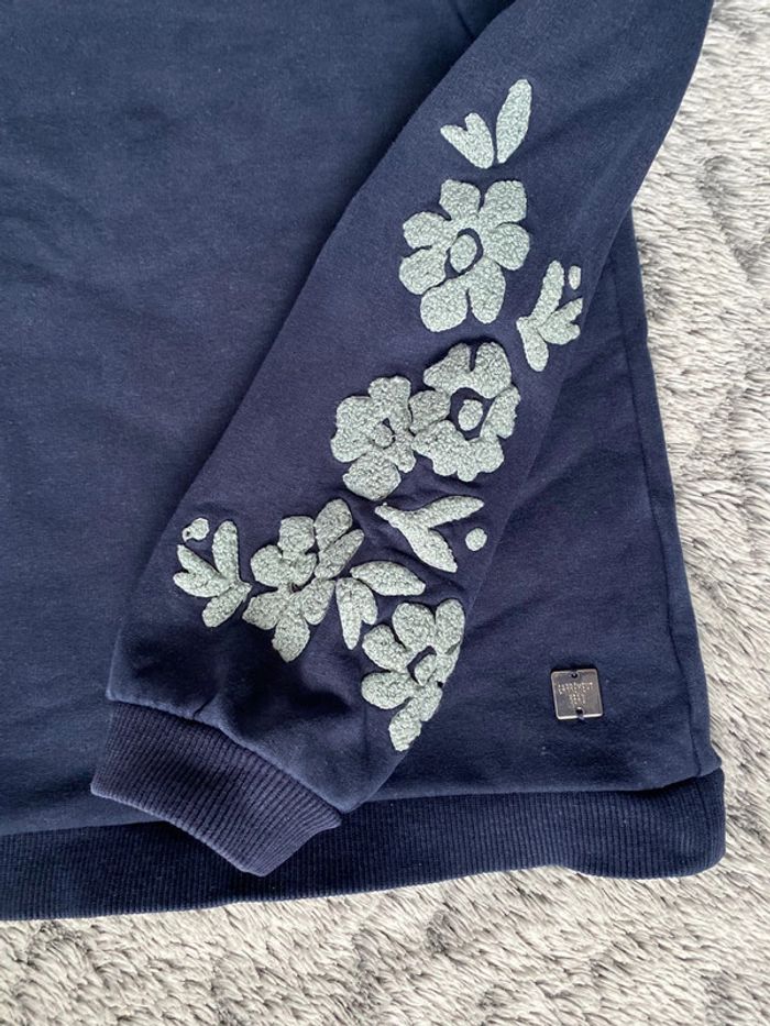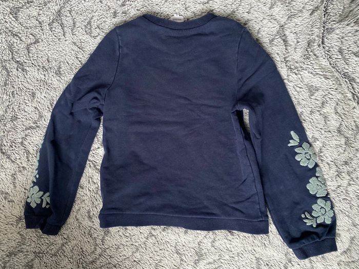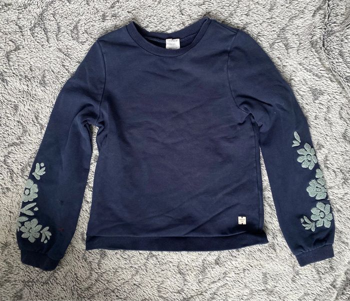 Pull bleu marine avec détail broderies en forme de fleurs sur les bras, marque Carrément Beau, en très bon état - taille 10 ans mais taille petit #cath_moi8ansfille #cath_moi10ansfille D'autres modèles et marques disponibles pour garçon du prématuré au 12 ans et pour fille du naissance au 10 ans