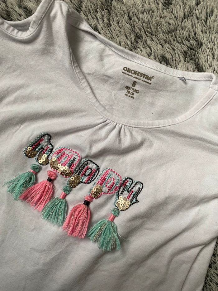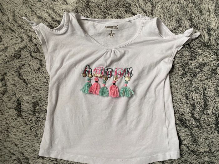 Teeshirt manches courtes avec motifs sur le devant, de la marque Orchestra, pas mal porté d’où le prix de vente - taille 6 ans #cath_moi6ansfille D'autres modèles et marques disponibles pour garçon du prématuré au 12 ans et pour fille du naissance au 6 ans dont Timberland, Bout'chou, Zara, Jacadi, Tape à l'œil, Okaidi, DKNY, Monoprix…