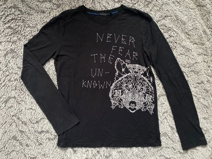 Tee-shirt manches longues, col V, motif 🐺 loup sur le devant, de la marque IKKS, en très bon état - taille 10 ans #cath_moi10ansgarçon D'autres modèles et marques disponibles pour garçon du prématuré au 12 ans et pour fille du naissance au 6 ans dont Timberland, Bout'chou, Zara, Jacadi, Tape à l'œil, Okaidi, DKNY, Monoprix…