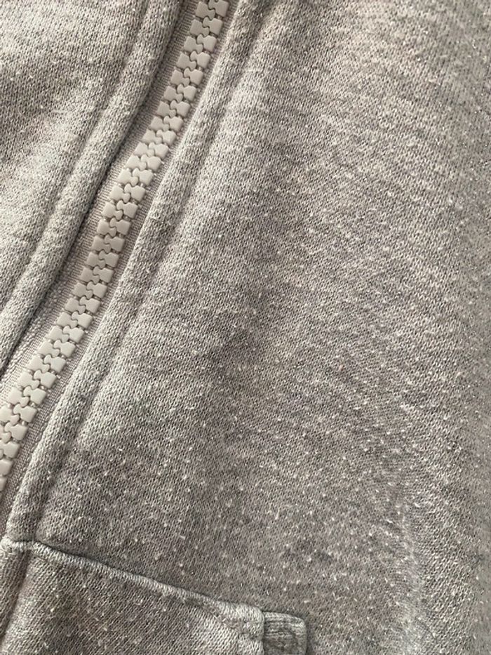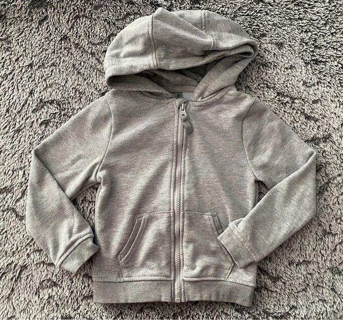 Veste à capuche avec fermeture éclair, couleur gris avec brillants, pas mal portée mais peut encore servir d’où le prix de vente - taille 5 ans