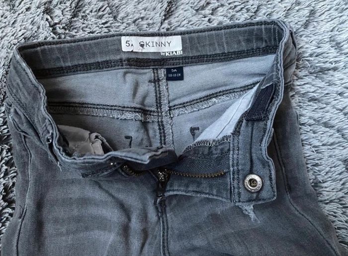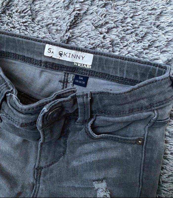 Pantalon jeans gris, coupe skinny, de la marque Kiabi, taille ajustable, en bon état - taille 5 ans #cath_moi5ansfille D'autres chaussures et vêtements disponibles pour garçon du prématuré au 10 ans et pour fille du naissance au 6 ans dont Timberland, Bout'chou, Zara, Jacadi, Tape à l'œil, Okaidi, DKNY, Monoprix...