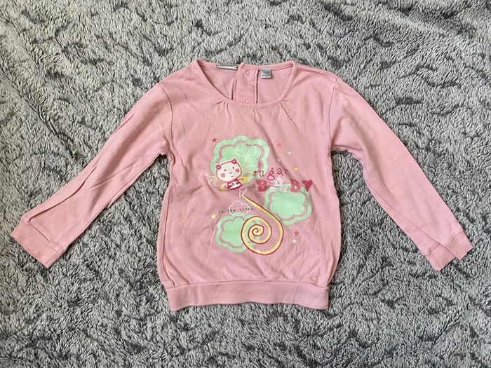 tee-shirt manches longues rose motif chat sur le devant, beaucoup porté d’où le prix - taille 5 ans