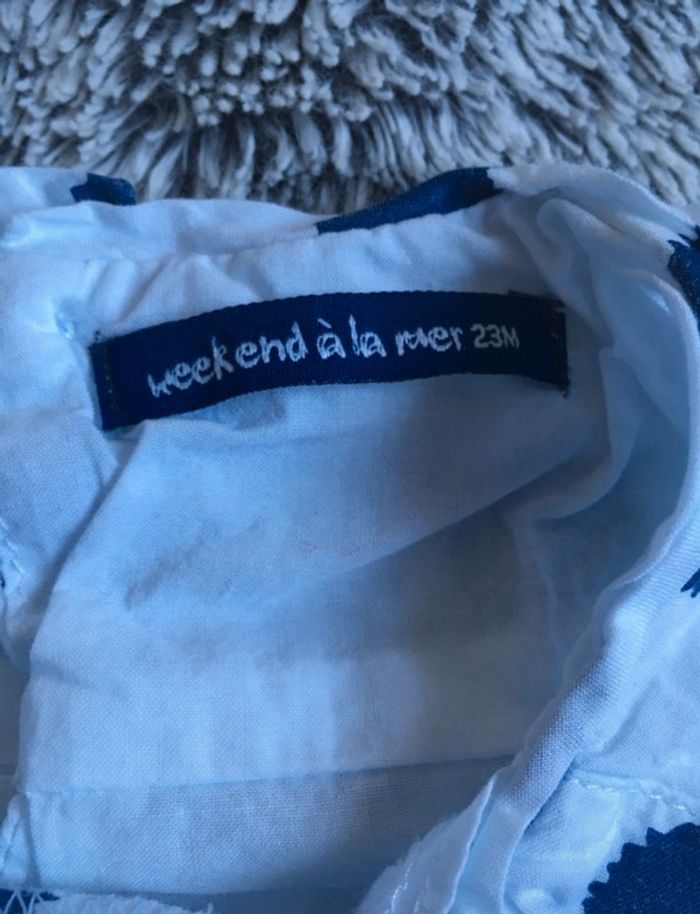 Robe blanche avec motifs bleu, de la marque « Week-end à la mer », neuve (jamais portée juste lavée), s’ouvre entièrement dans le dos - taille 2 ans #cath_moi24moisfille D'autres modèles et marques disponibles pour garçon du prématuré au 10 ans, et pour fille du naissance au 5 ans dont Timberland, Bout'chou, Zara, Jacadi, Tape à l'œil, Okaidi, DKNY, Monoprix....