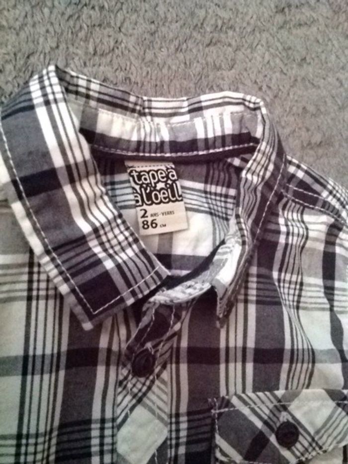 Chemise à carreau bleu marine et blanche en parfait état avec une poche sur le devant - Tape à l'oeil #cath_moi24moisgarçon D'autres modèles et marques disponibles pour garçon du prématuré au 8 ans et pour fille du naissance au 36 mois dont Timberland, Bout'chou, Zara, Jacadi, Tape à l'œil, Okaidi, DKNY, Monoprix....
