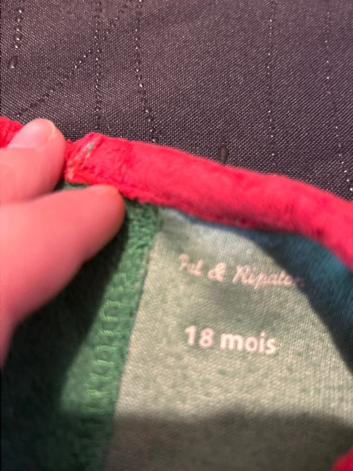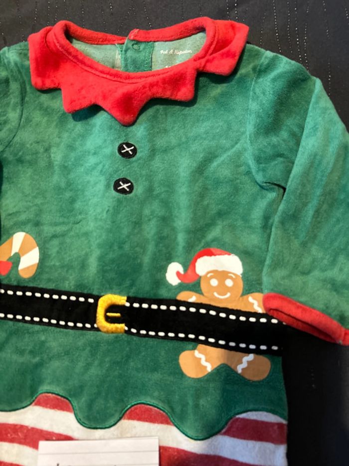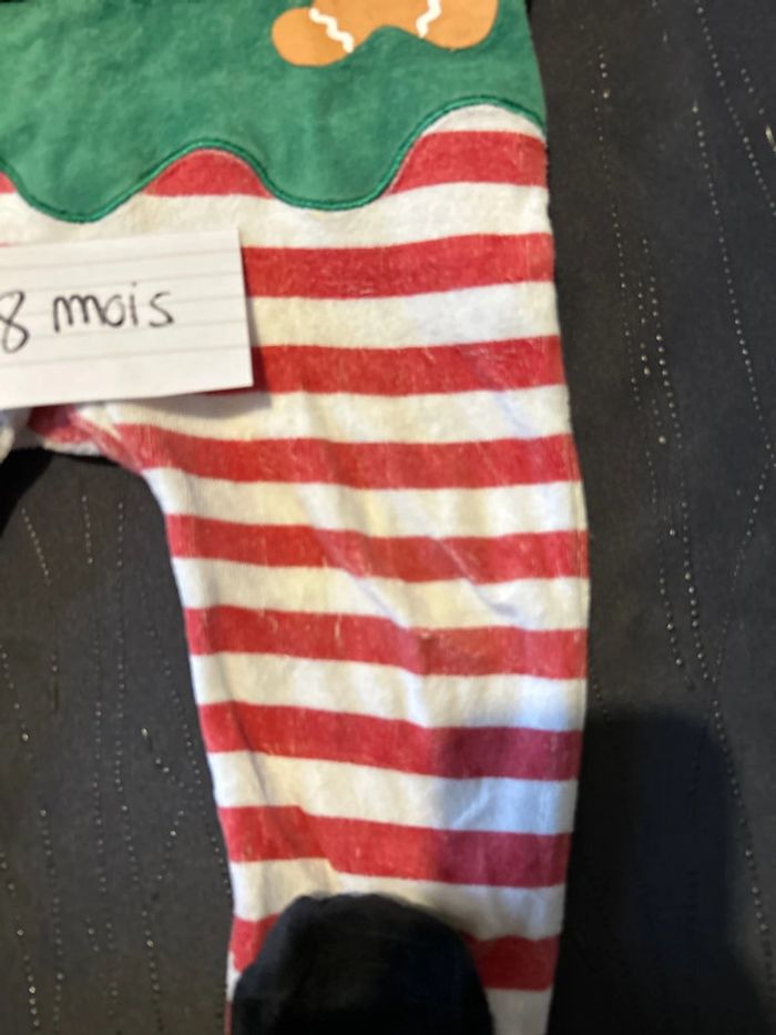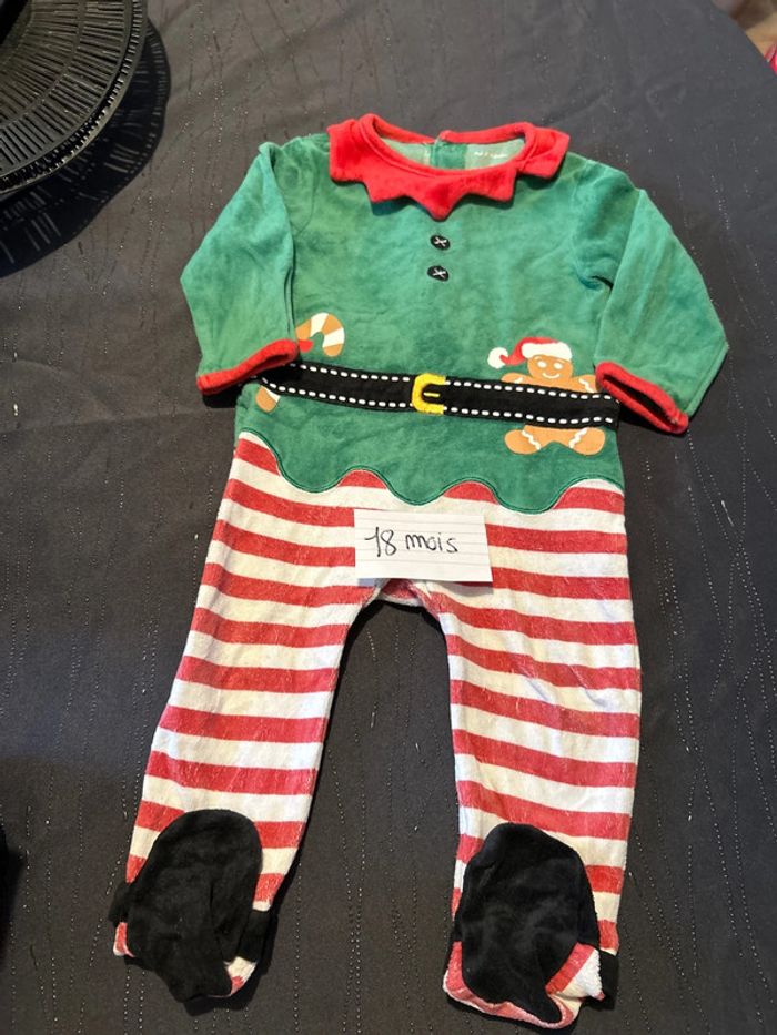 Pyjama de Noël style lutin avec pain d’épice Petit prix car le bas est légèrement décoloré et l’impression que les pressions tiennent mal #tatouwbebegarcon18mois