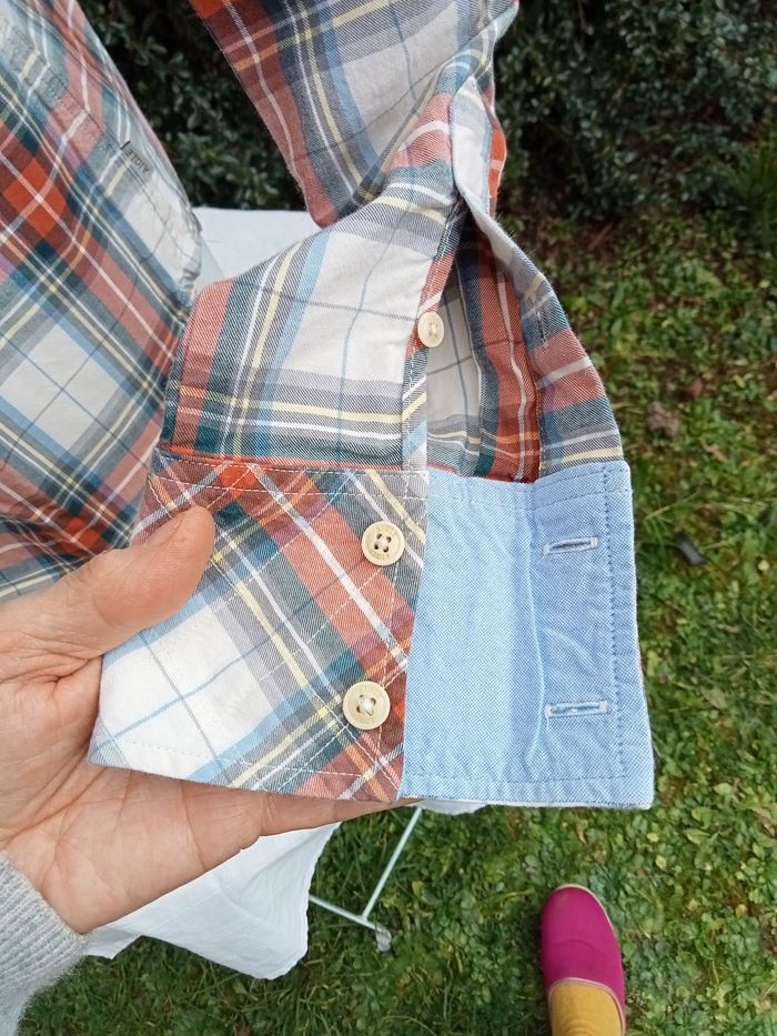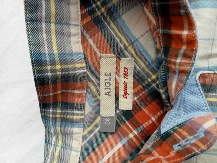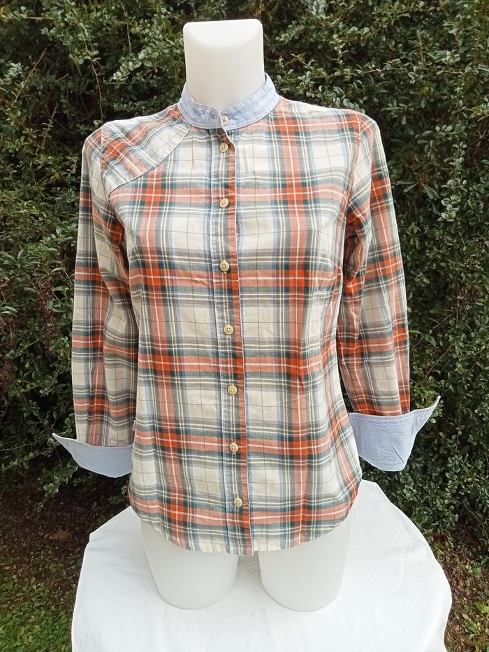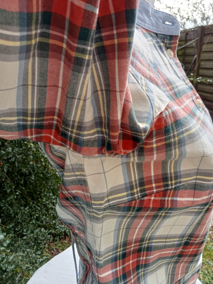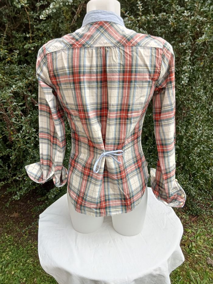chemise 💯%coton a carreaux, manches longues, très cintrée mais ajustable avec cordon dorsal. portée mais bien entretenue.