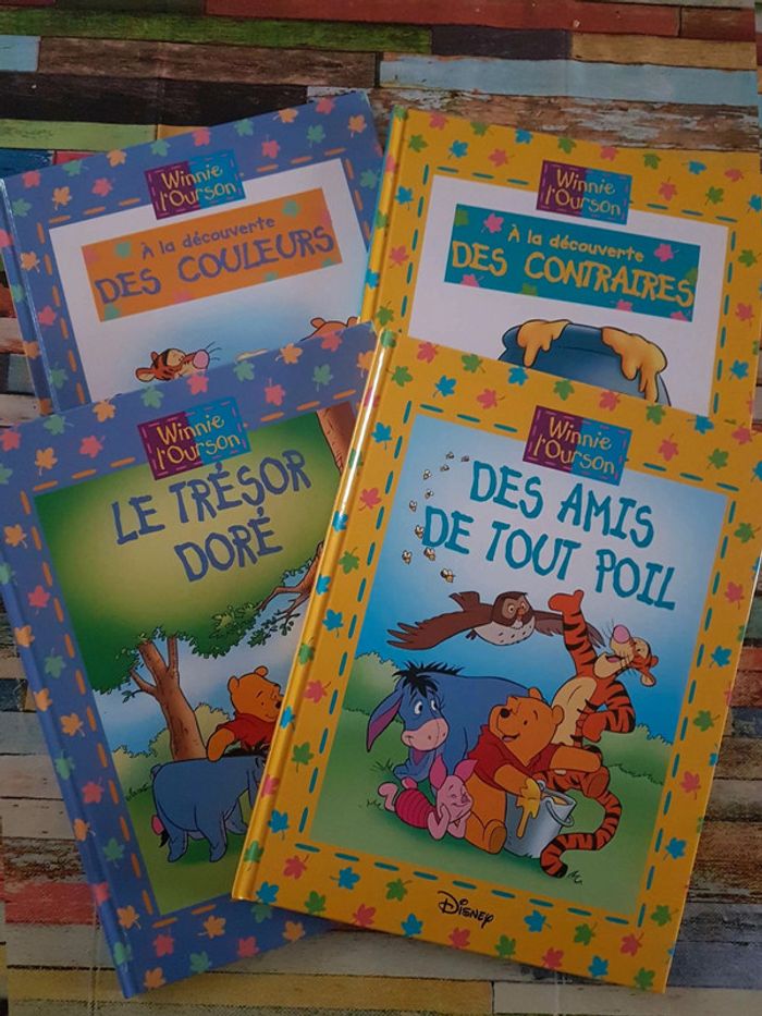 * des amis de tout poil - 32 pages * le trésor doré - 32 pages * à la découverte des couleurs - 24 pages * à la découverte des contraires - 24 pages En parfait état - jamais ouverts #decouverte #livreeducatif #livredisney #winnie #winnielourson #apprentissage #couleur #contraire