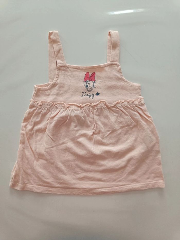 Débardeur large bretelles. Dessin : tête de Daisy avec un nœud rose. Inscription : Daisy 🖤 Article sans trou ni tâche. Taille : 24 mois / 86 cm / 12 kgs. #melody45340bebe24mois