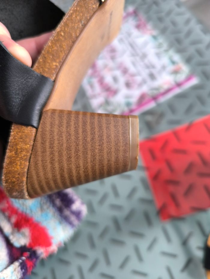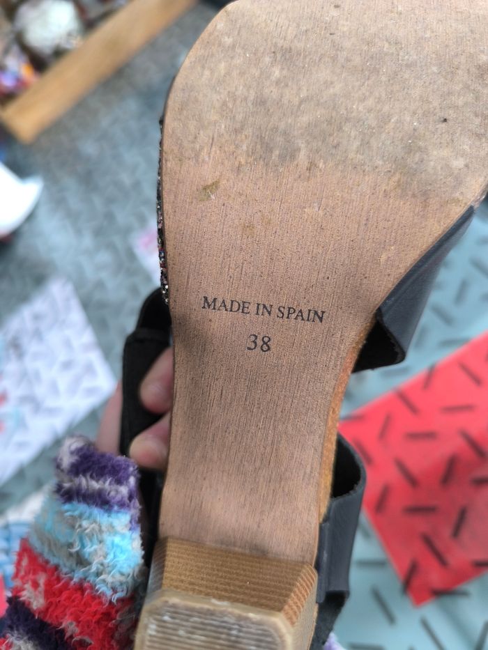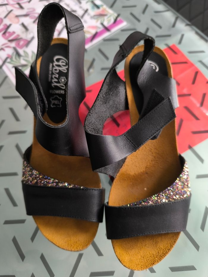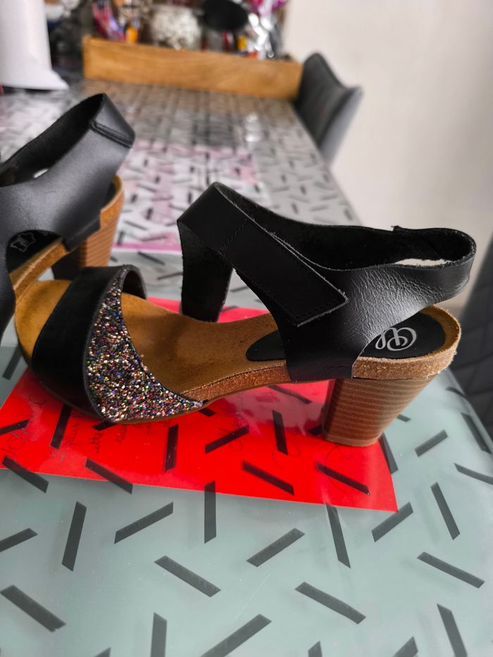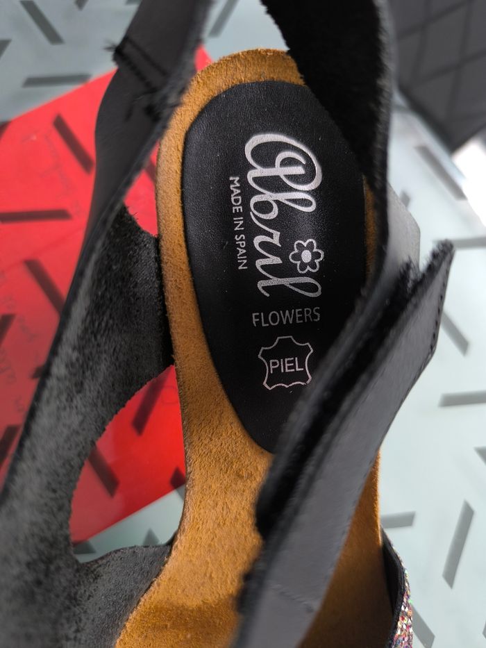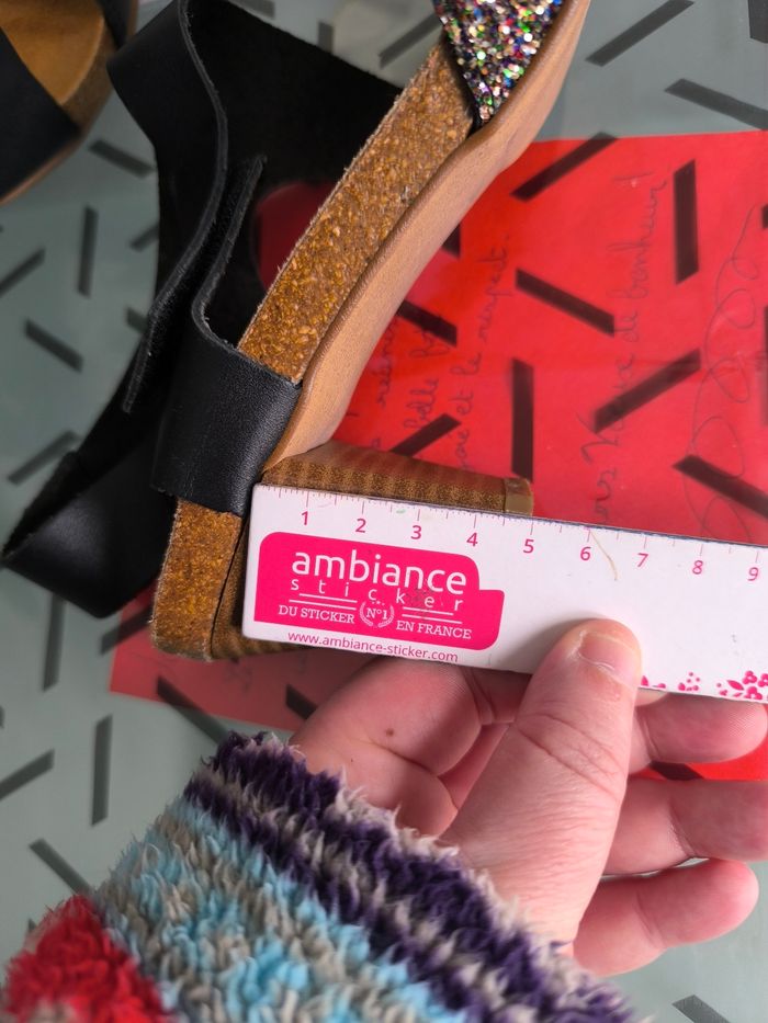 Marque:Abril Flowers Pointure:38 pas de photos portées je ne rentre pas dedans Couleur: Noir avec paillettes multicolores Talon: Voir photo Matière:Cuir si j'ai bien compris.. Fermeture:A scratch Etat: RAS usure normale Pas la boîte d'origine
