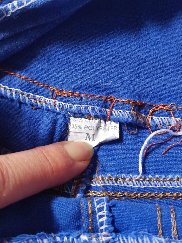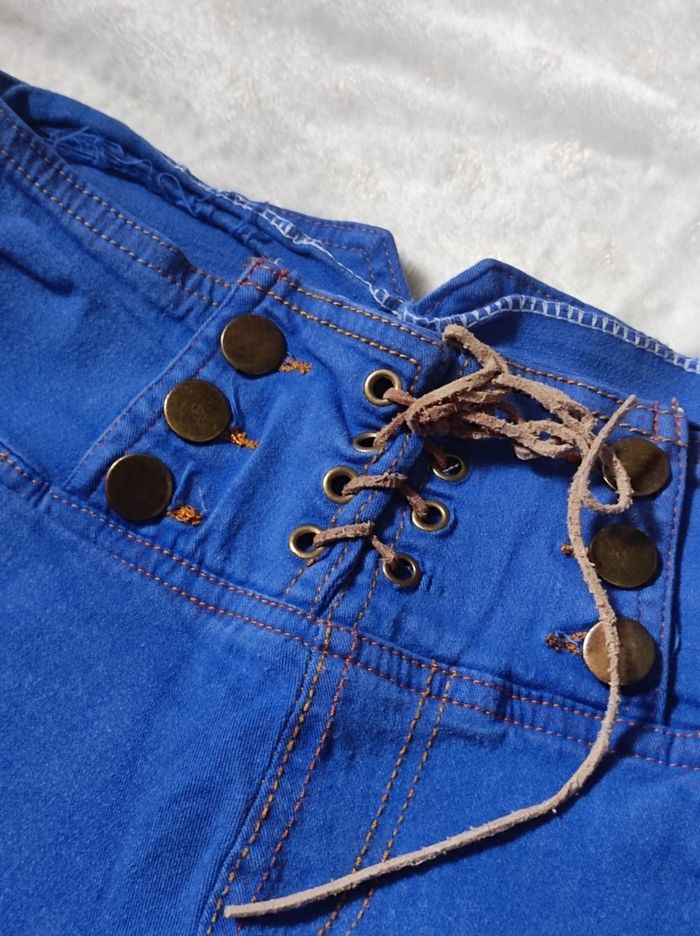 jolie mini short taille haute façon jean malléable, accessoires / attaches à boutons et lacet ainsi que plusieurs poches. De taille M 65% coton & 35% polyester. A peine porté en très bon état.