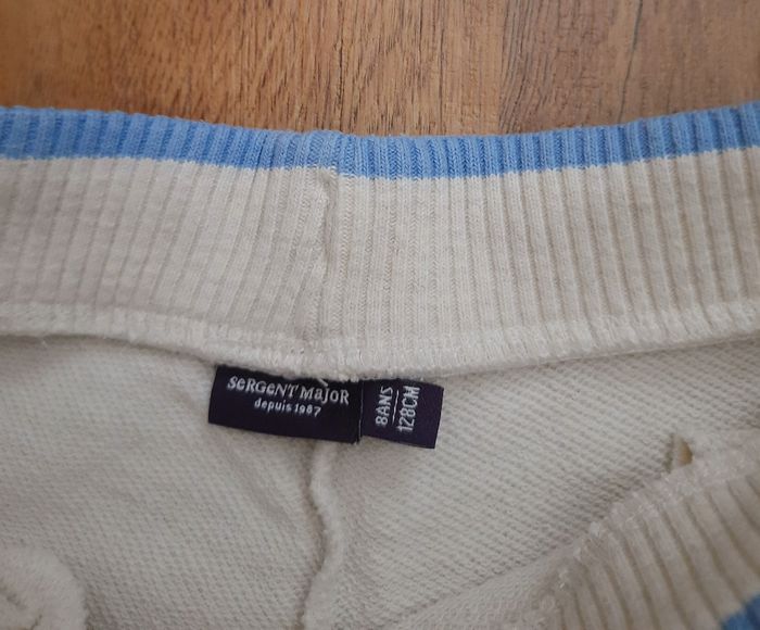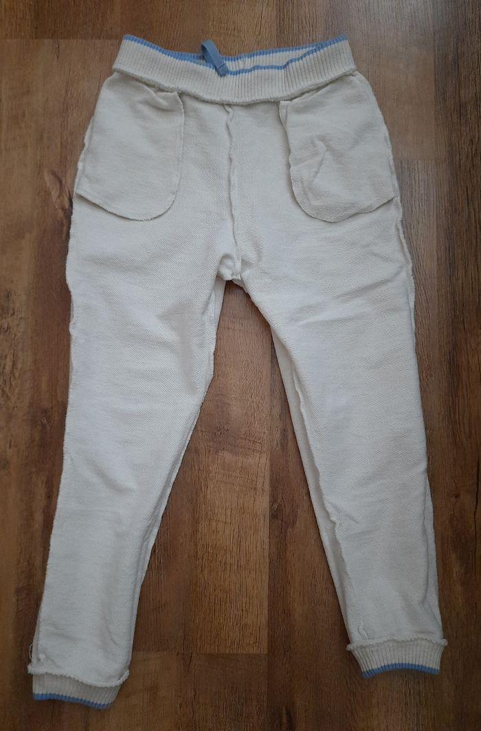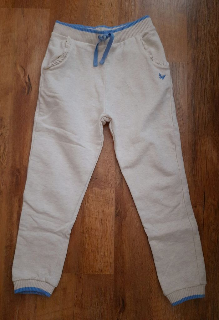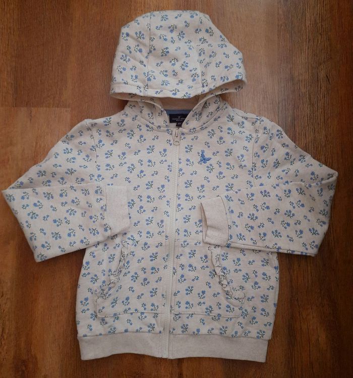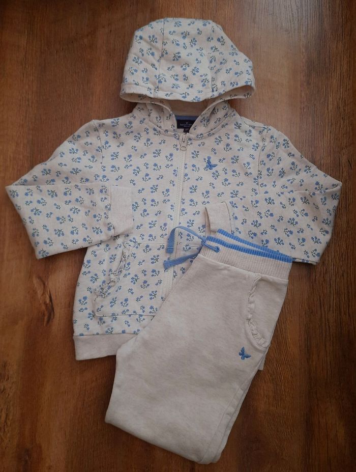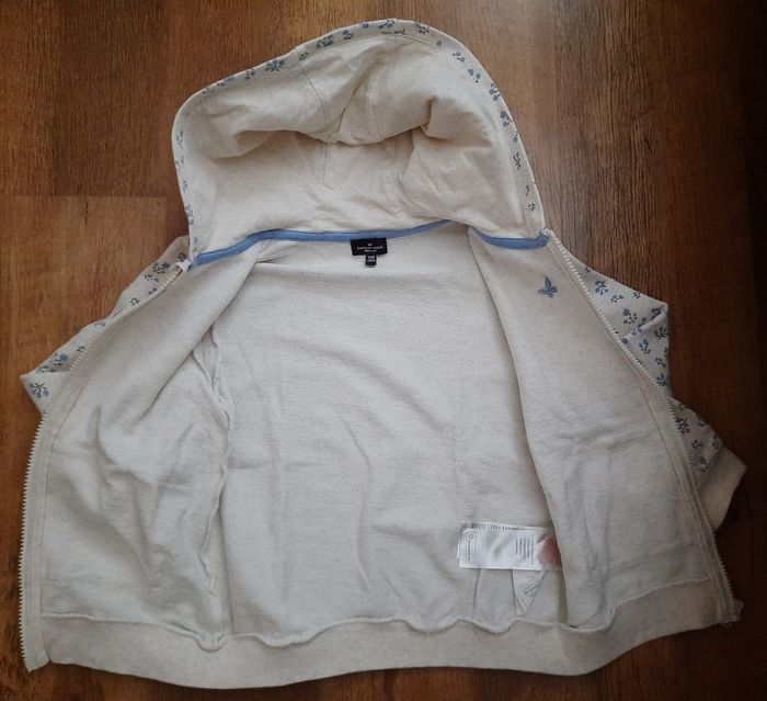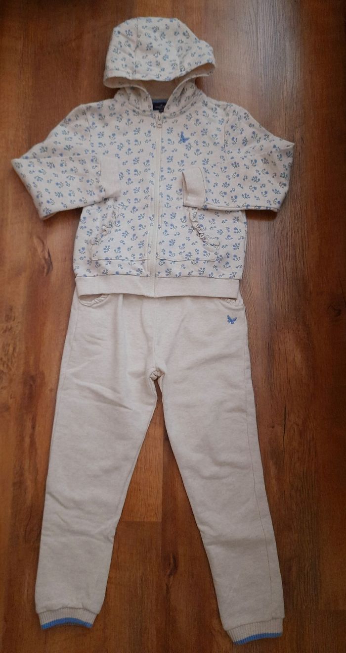 Très joli ensemble de jogging léger pour le printemps taille 8 ans 128cm composé: D'une veste zippée avec capuche doublée, motifs fleurs et broderie papillon, 2 poches avec volants. D'un pantalon avec cordon resserrable, broderie papillon, 2 poches. 1 petit fil rouge derrière le pantalon mais très peu visible, déjà présent lors de mon achat mais non constaté (voir dernière photo). Couleur beige chiné. Ensemble comme neuf, porté 1 seule fois.