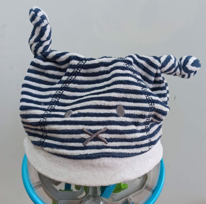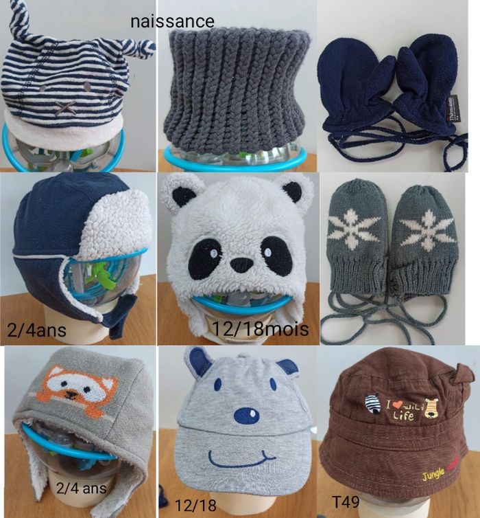 ENVOI en 24h/48h par MONDIAL RELAY. Pour Relais colis, shop to shop, ups : me consulter avant pour voir si c'est possible car pas sur ma route habituelle. AUCUN ENVOI en COLISSIMO ni colis privé 1ere main = initialement acheté neuf Maison non fumeur Maison sans chat ni rongeur ni N.A.C  stocké en compactor dans la maison.  Bonnet naissance  Un peu jauni sur les bords : voir photo Bonnet panda Orchestra T47 : 12-18m Bonnet bleu ( chapka / cagoule) sherpa isotoner couvrant les oreilles tres chaud  Taille 2-4 ans Cagoule isotoner motif renard.  Pour moi elle est plus grande que la bleu même si elle est également étiquettes 2-4ans. Snood naissance en laine  Mouffles laines Mouffles polaire 1 casquette grise T47 Légèrement taché sur la visière : voir photo  1 Chapeau été T49 = tout ce qui est sur la photo