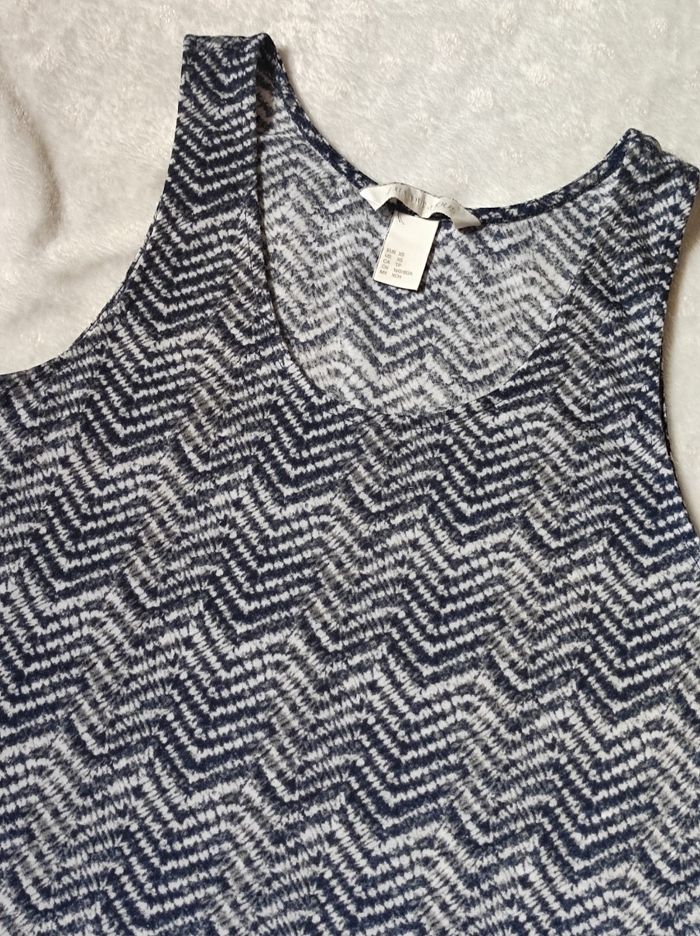 petit haut / débardeur à motifs strié noire et blanc. Visuellement ça ne se voit pas mais au toucher il est légèrement bouloché. Cependant ni trous tâches ou déchirures. Léger à porter. Marque h&m en taille xs.