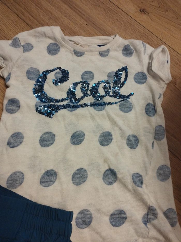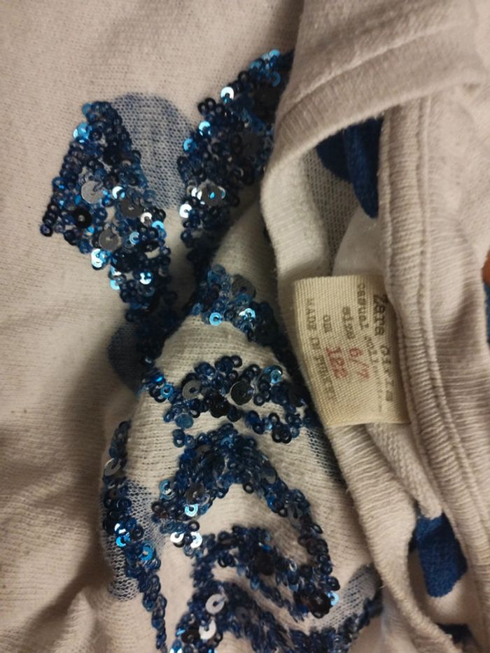 Lot composé de : - 1 t-shirt blanc Marque Zara Taille 6/7 ans Cool en sequins À pois bleu Présence d'une petite tache cf photo n°3 + 1 short de sport léger à inclure dans un lot. Minimum de commande fixé à 3€ ... merci