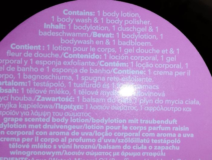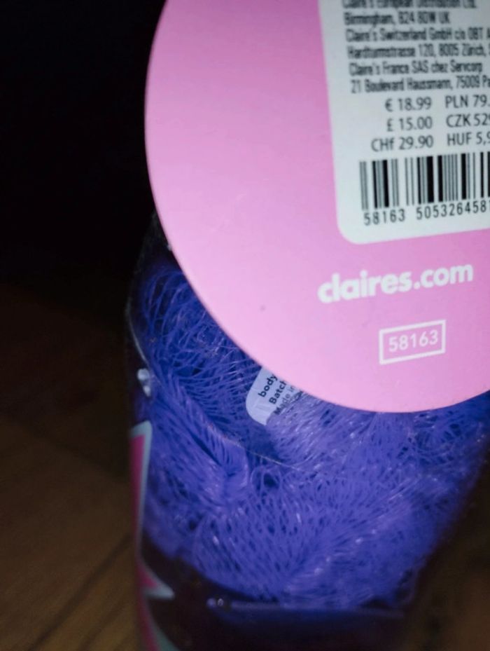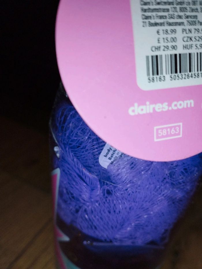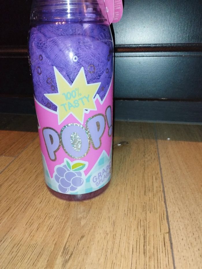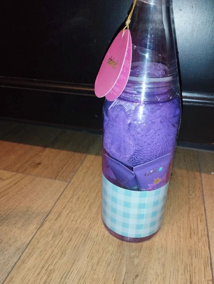 Kit cosmétique en forme de bouteille Jus de raisin Contient : -1 fleur de douche - 1 lotion pour le corps - 1 gel douche État neuf Marque claire's Marque: Claire's