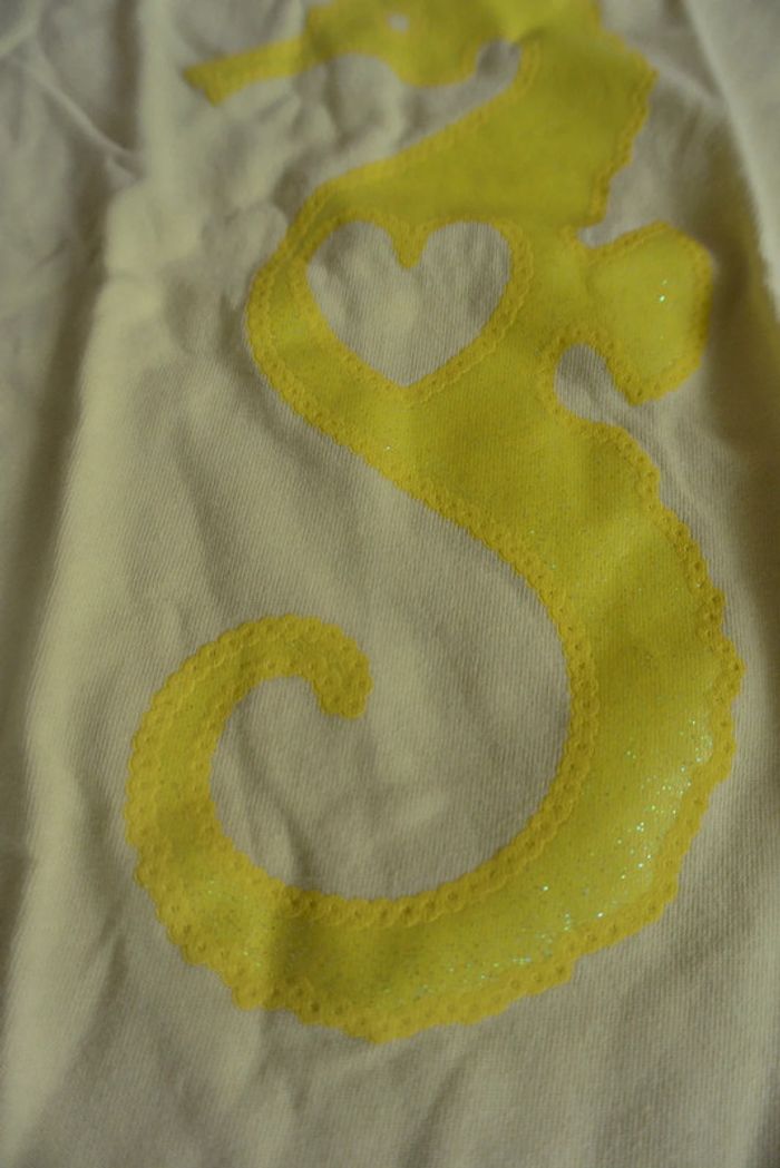 T-shirt à paillettes motif coeur et hippocampe coloris jaune marque Palomino C&A taille 4 ans Marque: C&A Taille: 4 ans / 104 cm A inclure dans un lot. Minimum de 3€ pour les envois
