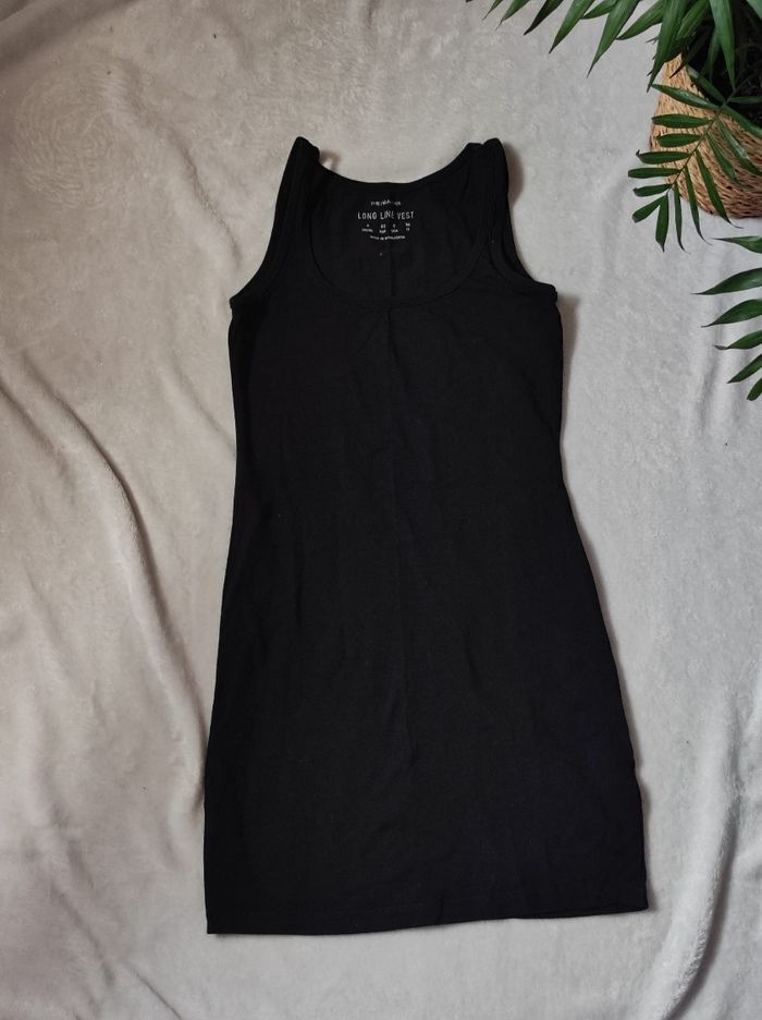 débardeur long noire , comme une mini robe courte. En très bon état ni trous tâches ou déchirures ( à attraper les petits poils de ma couverture et je retrouve pas mon rouleau, attention se ne sont pas des poils d'animaux je n'ai que des oiseaux). Marque primark en taille 32 / XXS